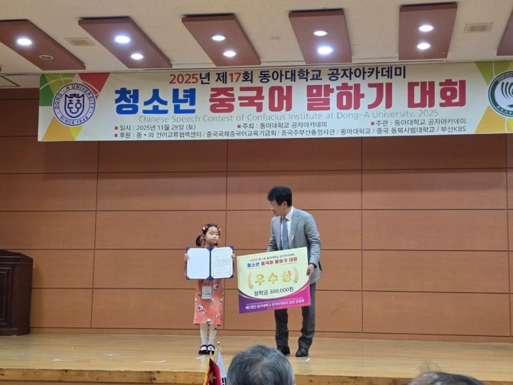 #동아대학교#공자아카데미#중국어말하기대회#청소년중국어#중국어대회#스피치대회#말하기대회#중국어학습 #중국어교육#중국어잘하는아이#대회수상#장학금#초등중국어#부산교육 #양산중국어#석산초#물금#중국어장학금 ✨동아대학교 공자아카데미 2025 청소년 중국어 말하기 대회, 우리 아이들이 해냈어요! 오늘은 정말 감격스러운 하루였습니다. 아이들이 2025년 동아대학교 공자아카데미 청소년 중국어 말하기 대회에서 멋지게 실력을 보여주고, 결국 수상까지 하는 놀라운 일이 있었기 때문입니다! 행사장은 많은 학생들, 학부모님들, 그리고 관계자분들로 가득했고, 모두가 긴장과 기대 속에서 무대에 올랐습니다. 하지만 두 아이는 평소 연습....... <img src="https://blogthumb.pstatic.net/MjAyNTExMjlfMTcx/MDAxNzY0NDA4NTE5MTQw.sxbQ9sarvE3AleeLMyUAARaIyGjOSXRhMYIvdhpipOsg.4QZsqKzlXTYvJ1Q5Ze6j9utaR4c6gCeKfXSaUOVuok4g.JPEG/IMG_9942.JPG?type=s3" />