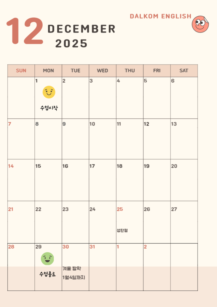 2025년의 마지막 달 입니다. 2025년의 마지막 달이 시작됐네요.12월을 어떻게 보내느냐에 따라 내년의 첫걸음도 달라질 것 같아요. 같이 차근차근 잘 마무리해봐요^^ 12월에는 중학생들 시험이 있고 그리고 달콤 친구들이 손꼽아 기다리는 달콤데이(마켓데이)가 있어요. 달콤 겨울 방학이 끝나고 나면 바로 겨울 특강이 시작됩니다. 달콤 선생님들만 따라오면 어느순간 영어실력이 탄탄해져 있는 나를 발견합니다! 추운 겨울 따뜻한 달콤영어에서 열심히 공부해보겠습니다! <img src="https://blogthumb.pstatic.net/MjAyNTEyMDFfMjUx/MDAxNzY0NTUyNzI5NjYx.OK8TP2oWG822_DBg1gVAf8iz_pxhR4mmp49VEveqoM0g.nVQgwaMq2qwJ6dg-ZNBsFWuOa_lvTNk8m81ZRK9nzo0g.PNG/12.png?type=s3" />