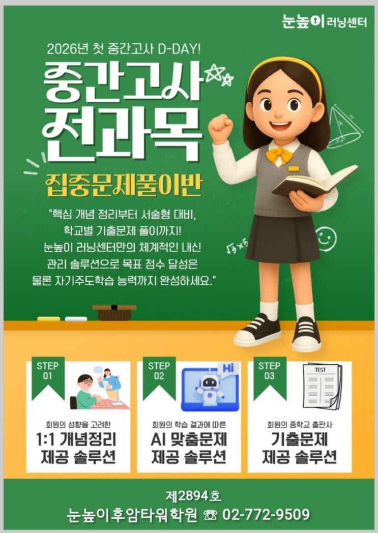 4월!26년 홍익여고1 중간고사 내신반 막차안내~~(4월 4일 개강/토요일1시-4시)