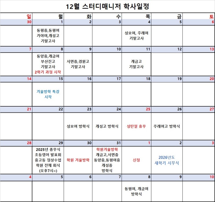 2025한해를 마무리 하며... 여러 기쁨과 환희의 순간들, 아쉬웠던 순간, 후회스런 순간들이 스쳐 갑니다. 그 모든 순간들이 아이들과 혹은 우리 학부모님들과 함께 했던 시간이라서 더 소중하게 느껴집니다. 안녕하십니까? 스터디매니저 학원입니다. 어느 덧 찬바람이 불며, 한해를 마무리 해야 하는 시점입니다. 올해 계획하신 일들은 다 이루셨는지요? 학원 운영도 2025년 되돌아보니, 최선을 다했지만, 부족하고 아쉬운 모습 또한 많이 보였습니다. 2025년의 남은 12월을 한달을 잘 정리하면서, 부족한 점은 잘 보완하여, 더욱 내실있는 학원이 될 수 있도록 최선을 하겠습니다. 먼저 12월 학사일정입니다. 12월 초부터 중고등부 기말고사가 진....... <img src="https://blogthumb.pstatic.net/MjAyNTExMjhfMjc3/MDAxNzY0MzI5ODk0NzAy.vN9brTms8nL5U62wVkW9HdtRh9d7JEWZmMEVIw_1uaYg.3_mEA7ka17VDdlcYMQmLlbi29Q-N_JHMAG4XeFgLr8cg.JPEG/12%BF%F9%C7%D0%BB%E7%C0%CF%C1%A4.jpg?type=s3" />