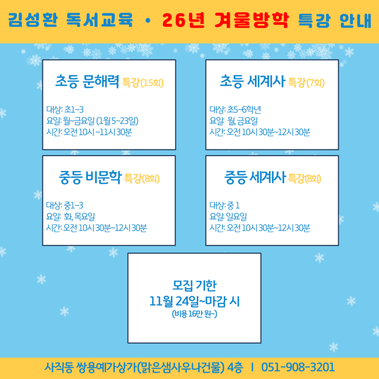 부산 사직동 독서논술, 국어 전문 '김성환 독서교육' 26년 겨울방학 특강 안내