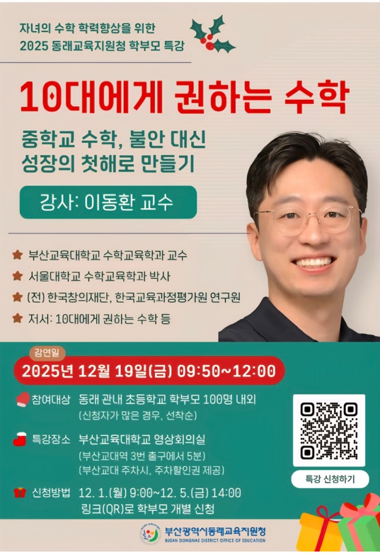 동래구 교육지원청에서 "중학교 수학, 불안 대신 성장의 첫해로 만들기"라는 주제로 부산교대 수학교육학과 교수님을 모시고 학부모 강연을 합니다. 우리 아이의 수학교육에 관심이 많은 부모님들께서는 시간을 내어 꼭 참석하면 좋을 것 같습니다!! 동래구 수학 전문학원 생각하는 수학입니다!! <img src="https://blogthumb.pstatic.net/MjAyNTExMjhfMjE4/MDAxNzY0MzE5MTUyMTgy.BaV5orXG-3-MSQpGRZtIqrRTHe3u_0aTfMVejOQDFOYg.Bbr5AyE2KTwGhJwKlwJDh5J7OHtAEZ_8MSp_GX4vAh4g.JPEG/900%A3%DFScreenshot%A3%DF20251128%A3%DF105707.jpg?type=s3" />