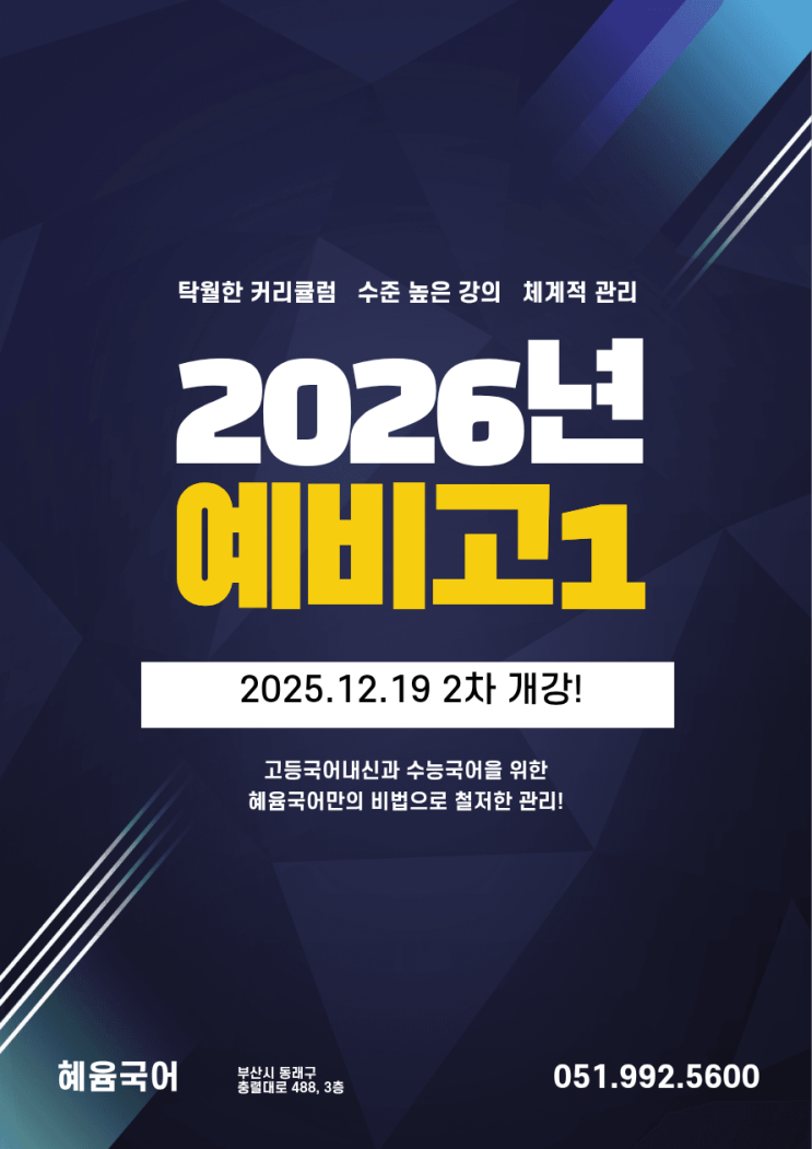 #예비고1 #안락동 #국어학원 국어는 혜윰! 안녕하세요. 혜윰국어입니다. 예비고1 국어 개강 안내입니다. [대상] 예비고1 금정고등학교 남일고등학교 대명여자고등학교 센텀고등학교 용인고등학교 충렬고등학교 학산여자고등학교 혜화여자고등학교 [개강일] 2025. 12. 19 자세한 문의는 992-5600으로 부탁드립니다. 감사합니다. 국어가 차이를 만듭니다. 신고 제5199호 부산국어학원 동래국어학원 안락동국어학원 센텀국어학원 반여동국어학원 재송동국어학원 명장동국어학원 금정고국어학원 대명여고국어학원 센텀고국어학원 용인고국어학원 충렬고국어학원 학산여고국어학원 혜화여고국어학원 <img src="https://blogthumb.pstatic.net/MjAyNTEyMDJfMzQg/MDAxNzY0NjQ4NzU1MTgy.gzb05TdAO4HLQmWr1_9lbqihTyMshFh42-lvhy_9Tlcg.rmDtzG4e_FyqKof86RZF29HWqrK7Zcs-3Wgqb0Jp25Qg.PNG/%BF%B9%BA%F1%B0%ED1_20251202.png?type=s3" />