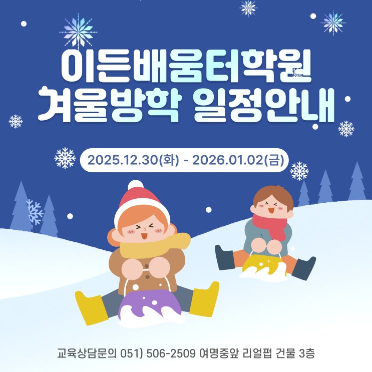 안녕하세요~ 이든배움터학원입니다 계절이 바뀌고 어느덧 한 해를 마무리하는 겨울이 다가왔습니다 아이들은 지난 한 해 동안 성실하게 자신의 자리에서 최선을 다했고, 그 시간들이 차곡차곡 쌓여 지금의 성장으로 이어지고 있습니다 저희 이든배움터는 아이들이 공부의 결과뿐 아니라 과정 속에서 배우는 끈기, 책임감, 자기관리 습관이 얼마나 중요한지 매일 수업 현장에서 직접 느끼며 아이들과 함께하고 있습니다 그리고 그 모든 과정의 뒤에는 늘 믿고 보내주시는 학부모님들의 신뢰와 응원이 있기에 가능한 일임을 잘 알고 있습니다 진심으로 감사드립니다 ♥ 겨울방학기간 ♥ 2025년 12월 30일(화) ~ 2026년 1월 2일(금)까지 (총3일간) 이....... <img src="https://blogthumb.pstatic.net/MjAyNTEyMDNfODQg/MDAxNzY0NzM0NTM1NDM0.g_lO39sc-Rlvz3gaxrKELLo_0Tv9Z_oHGfoH418opgwg.7eqjJ47Oc4r5uy-yUn5bOUK6Qkmos5kLFQfBjRNmlYcg.JPEG/%C1%A6%B8%F1%C0%BB-%C0%D4%B7%C2%C7%D8%C1%D6%BC%BC%BF%E4_-001_%282%29.jpg?type=s3" />