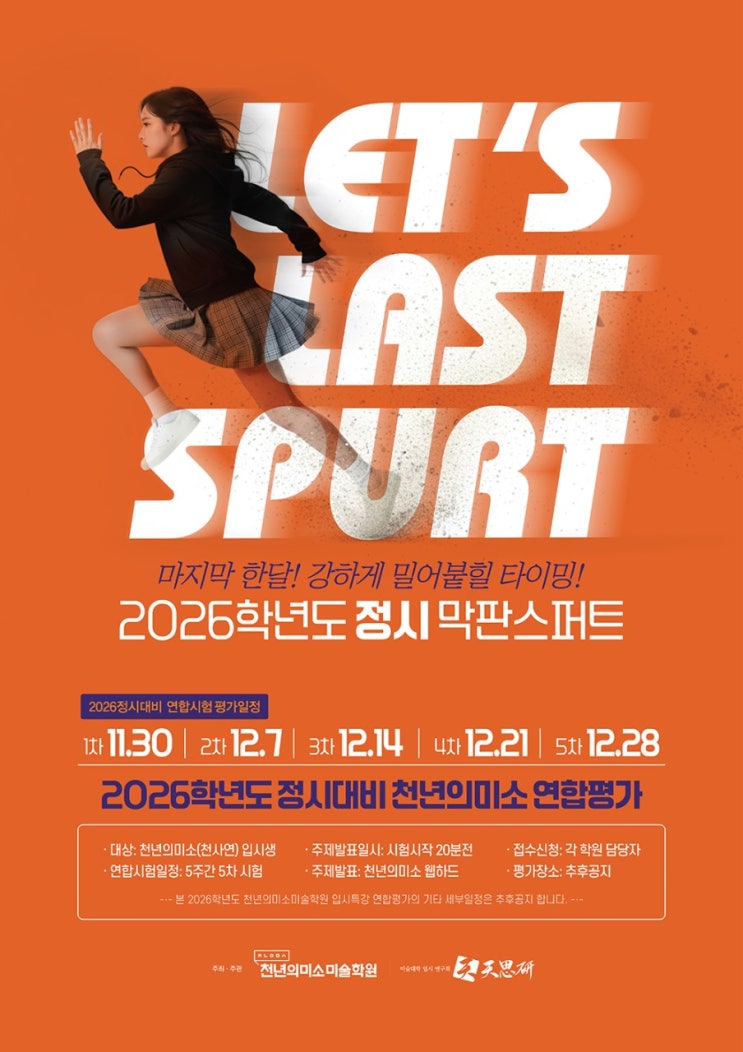 부산명륜 천년의미소입니다. 2026학년도 정시 합격을 위한 막판 스퍼트 일정입니다~ 매회 연합시험 평가를 받으면서 쑥쑥 성장할 천미인들을 화이팅합니다~~~~ #부산천년의미소미술학원 #명륜천년의미소미술학원 #부산명륜천년의미소미술학원 #부산예술고입시미술학원 #부산예술고등학교미술과 #부산예고편입미술학원 #브니엘예술고입시미술학원 #브니엘예중입시미술학원 #부산예중입시미술학원 #한국조형예고입시미술학원 #부산예술고등학교 #브니엘예술고등학교 #명륜동미술학원 #동래미술학원 #명륜동입시미술학원 #부산시미술영재미술학원 #부산대예술영재원미술학원 #부산대미술영재 #연산동미술학원 #센텀미술학원 #구서동미술학원 #안락동....... <img src="https://blogthumb.pstatic.net/MjAyNTEyMDVfMjQw/MDAxNzY0OTM1NjE3ODk4.w-8ODNsaHG3gtAaSsOz7w6lkGQHsPiXCx4Ft5PuIdxcg.CnzfDbBWE44eVKxvSl63plcgka_wp4jweKw1kwgc6gUg.JPEG/KakaoTalk_20251203_153921857.jpg?type=s3" />