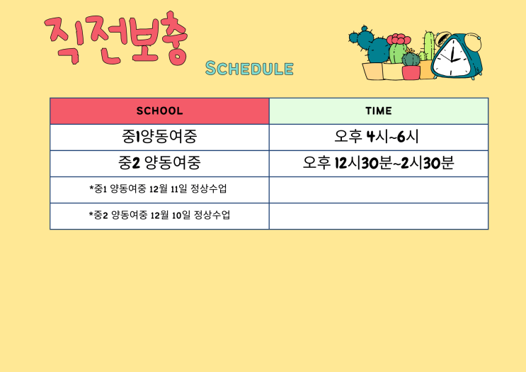 안녕하세요 양정에 위치한 위드미 잉글리시 입니다 ! 내신대비 마지막 주말 보충입니다 ^^ 이제 진짜 당장 다음주!!! 정말로!! 코앞으로 다가온 내신 시험입니다 공부하면 할 수록 계속 부족하고 아직 실수하는 문제들만 보이며 불안한 마지막 주말일텐데요. 마지막 그 한 끝의 차이를 찍을 시험 대비 기간이 긴 탓에 가장 기본적인 내용을 까먹었을수도 있어요!! 그 마지막 정리를 하는게 바로 직전보충입니다 (오늘 들었던게 내일 바로 시험에 나온다니??????) 양동여중 직전보충 일정 안내 포스팅입니다 ^^ 기말고사 시험 첫 날부터 주요 과목 시험이 많은 양동여중입니다 그래서 정리해야할게 많을텐데요... 마지막 직전보충 2시간으로 마무....... <img src="https://blogthumb.pstatic.net/MjAyNTEyMDZfMTUy/MDAxNzY1MDA1ODIzNDg5.KW0hsYxtr9mu1d5YEarGy3L9qC-H2ayE8CseDmwknqkg.rh1VlwVwwYhGGQtYBBJQ0EiIYBNv9L2jkMItF6Wpq-Qg.PNG/Back_to_School_Class_Schedule_Document_in_Colorful_Doodle_Style.png?type=s3" />
