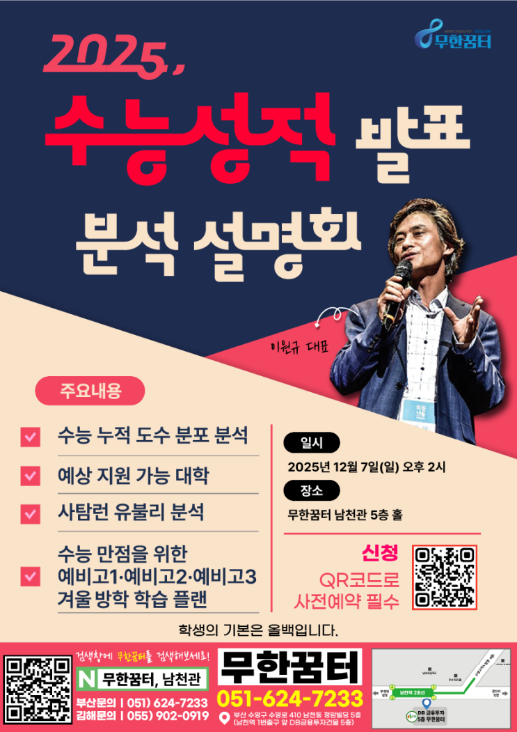 2025 수능 성적 발표 분석 설명회 12월 7일(일) 오후 2시 | 무한꿈터 남천관 5층 홀 안녕하세요, 무한꿈터입니다 지난 예비고3 1차 설명회 후기 공유드립니다. 1차 설명회에서 안내드렸던 것처럼 수능 성적 발표 이후, 반드시 알아야 할 핵심 내용만 모아 2차 설명회를 진행합니다. 수능 성적표는 단순 점수표가 아니라 “우리 아이가 실제 전국에서 어떤 위치에 있는지” 그리고 “어떤 대학이 현실적으로 가능한지” 를 보여주는 가장 중요한 자료 입니다. 이번 2차 설명회는 예비고3뿐 아니라 예비고2 · 예비고1 학부모님께도 꼭 필요한 내용으로 구성했습니다. 입시는 매년 변화하지만, 결국 준비해야 하는 핵심은 언제나 같....... <img src="https://blogthumb.pstatic.net/MjAyNTEyMDZfNTkg/MDAxNzY0OTg0MDM3ODM5.EmzKdTxmJDuFxioQBQ3fRD0KtNzFzIHqI2-GL-4EUFMg.YWqPGlXRqDJBw6-FMW9KuMLH0pbuv2lbfJTNaGR9BzAg.PNG/%B9%AB%C7%D1%B2%DE%C5%CD_%BC%F6%B4%C9_%BC%BA%C0%FB_%B9%DF%C7%A5_%BA%D0%BC%AE_%BC%B3%B8%ED%C8%B8_%C6%F7%BD%BA%C5%CD.png?type=s3" />