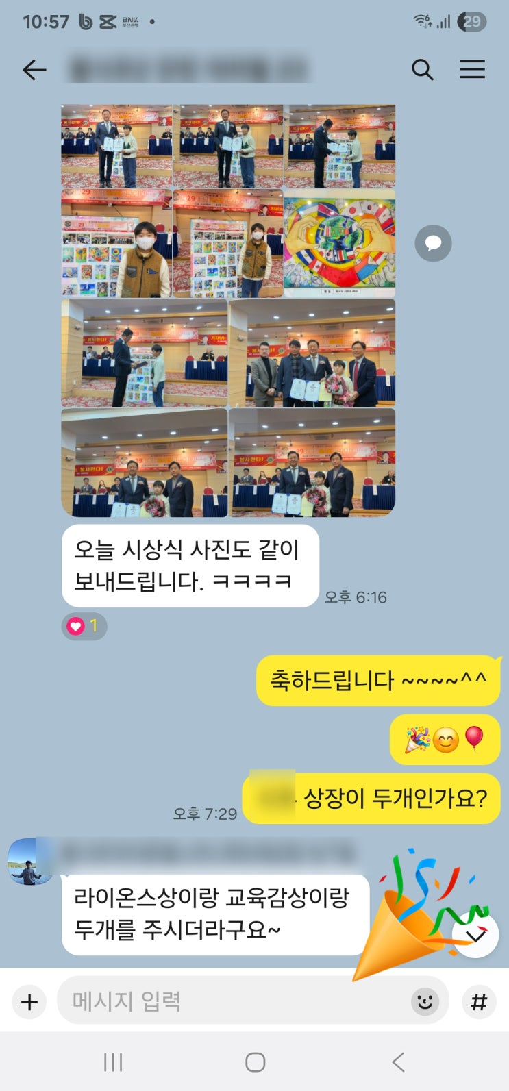 라이온스 평화포스터 경연대회 ‘대상’ 수상! 우리 갤러리 친구가 이번 대회에서 무려 대상을 받았어요! 그림 그릴 때마다 눈이 반짝이더니, 결국 이렇게 멋진 결과를 만들어냈네요 라이온스상과 교육감상!!! 시*가 두개를 받아왔네요~^^ 아이도 “너무 신난다!”며 하루 종일 웃음이 떠나질 않았답니다. 무엇보다 어머니께서 너무 기뻐하시고 아이에게 큰 칭찬을 아끼지 않으셨어요! “정말 잘했다”며 함께 웃고 행복해하시는 모습이 더 따뜻한 순간이었습니다. 이번 수상은 즐겁고 기쁜 경험일 뿐만 아니라 앞으로 자소서 작성이나 예술 계열 진학 준비에도 큰 힘이 되어줄 소중한 이력이에요. 재미있게 그린 그림이 아이의 미래에....... <img src="https://blogthumb.pstatic.net/MjAyNTEyMDVfMTky/MDAxNzY0OTQ0MDI2MDcy.wia5NWcrJyHw_QOTftFUCFWczECwTvcSm1L5jI50BhUg.UvwDIcK9M5z8inCFP0aWbhuqPz9TYQAdeV2QS56j9T8g.JPEG/KakaoTalk_20251205_225808848.jpg?type=s3" />