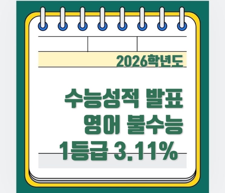교육과정평가원, 2026학년도 수능 채점 결과 발표 국어, 지난해 수능보다 어렵게 출제…‘불수능’ 확인 영어 1등급 비율 3.11%…절대평가 전환 이후 최저 대입 당락 ‘불수능’ 확인된 국어·영어 성적에 달려 [이데일리 신하영 기자] 지난달 13일 실시한 2026학년도 대학수학능력시험에서는 국어와 영어가 어렵게 출제된 것으로 확인됐다. 특히 영어 1등급 비율은 절대평가로 전환한 이래 가장 낮았을 정도여서 ‘역대급 불수능’이란 평가가 나온다. 수능 출제 기관인 한국교육과정평가원(평가원)은 이같은 내용의 ‘2026학년도 수능 채점 결과’를 4일 공개했다. 올해 수능 응시자는 총 49만 3896명으로 이 중 67.4%(33만 3102명)는 고3 재학....... <img src="https://blogthumb.pstatic.net/MjAyNTEyMDVfMjQw/MDAxNzY0OTA5ODA3MTM2.g9lDQNQdQ21Lve2-860O4y675DN33FnWtUIsVRKsEWYg.Mg3_-ncF-KU6bZp7A0OAeUjnq5eVogdXg68a4INjPDMg.JPEG/900%A3%DF20251205134142.jpg?type=s3" />