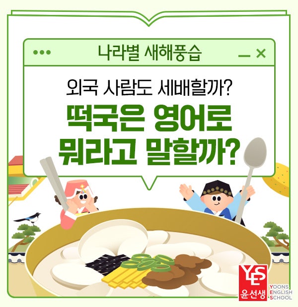 새해를 맞이하는 마음은 전 세계가 비슷하지만 그 마음을 표현하는 방법은 나라별로 각양각색이에요. 어떤 나라는 절을 하고, 어떤 나라는 물을 붓고, 또 어떤 나라는 접시를 깨거나 바다에 뛰어들며 새해를 맞이해요. 오늘은 2026 설날 특집으로, 나라별 새해 풍습을 비교해 보며 새해인사 영어로, 세배 영어로, 떡국 영어로까지 함께 알아보려 해요. 그럼 세계의 새해 풍습 속으로 함께 떠나볼까요? 세배와 떡국은 영어로 어떻게 말할까? 어른들께 공손히 절을 올리는 세배는 어른에 대한 존경과 새해의 복을 비는 의미를 담고 있어요. 세배 영어로 표현한다면, a traditional New Year’s bow to elders라고 할 수 있어요. 떡국을 영어로 하면....... <img src="https://blogthumb.pstatic.net/MjAyNjAyMTJfOTkg/MDAxNzcwODU1MjMyODE3.NXUjc7LONFeMh5CSVI7CxkRUfetMSEHo83vUBbaVuEEg.O_ZZrZ9pagciGbGhmkJyaT5RLKSSNqzsxFvM8gWmjYsg.JPEG/yoons-english-newyear-culture-Thumb-blog.jpg?type=s3" />