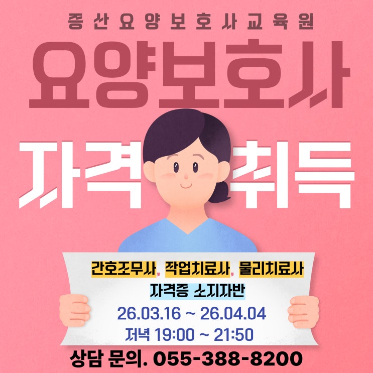 증산요양보호사교육원 26년 간호조무사, 작업치료사, 물리치료사 자격증 소지자반 개강~!!! 모집 안내 안녕하세요! 증산요양보호사교육원입니다 간호조무사 있으시분들~ 여기로 모여라~~~!! 야간반 일정 기간: 2026년 3월 16일(월) ~ 2026년 4월 4일(토) 시간: 저녁 19:00 ~ 22:00 수업: 하루 3교시 진행 밤 시간을 활용해 집중적으로 배우고 싶으신 분들께 추천드립니다. 문의 & 접수 궁금한 점이나 수강 신청은 언제든 연락주세요! ☎ 055-388-8200 친절하게 상담해드리겠습니다 증산역1번출구 건너편 증산요양보호사교육원 경상남도 양산시 물금읍 서들8길 49 더베스트타워 5층 국비지원 수강....... <img src="https://blogthumb.pstatic.net/MjAyNjAyMTNfMTMy/MDAxNzcwOTY3ODQzNTkz.EYV3ssbkfvEW0lje5NznaCsrrs7QHQ8P2xj3YR71Odog.25d9QYBnsoQhGh5Kvu06zivuA6q0KDVB4IWEeNwqlQwg.JPEG/%C1%A6%B8%F1%C0%BB-%C0%D4%B7%C2%C7%D8%C1%D6%BC%BC%BF%E4_-001_%282%29.jpg?type=s3" />