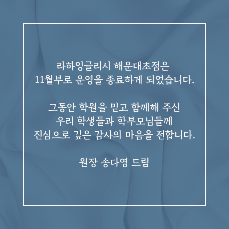 안녕하세요. 라하잉글리시입니다. 아쉬운 소식을 전하게 되었습니다. 라하잉글리시 해운대초점은 개인사정으로 11월부로 운영을 종료하게 되었습니다. 그동안 학원에 보내주신 신뢰와 성원에 진심으로 감사드립니다. 우리 학생들의 성장을 함께할 수 있어 큰 보람이었으며, 학부모님들의 꾸준한 관심과 응원이 큰 힘이 되었습니다. 그동안 함께해 주신 모든 분들께 깊이 감사드리며, 앞으로도 우리 학생들의 밝은 앞날을 진심으로 응원하겠습니다. 감사합니다. 원장 송다영 드림 <img src="https://blogthumb.pstatic.net/MjAyNTExMjZfMzEg/MDAxNzY0MTI2OTk5MzU0.PAGFwR8WSFpANvBxQr2R09g2x__El1sQ-haASb4xeKsg.uTPDsrF51b-NjeOZi_vtYI58AAq55heUcOB36DC24vgg.PNG/%B3%B2%BB%F6_%B1%F2%B2%FB%C7%D1_%BF%EC%BE%C6%C7%D1_%B0%A8%BB%E7_%C0%CE%BB%E7_%C4%AB%B5%E5_%C0%CE%BD%BA%C5%B8%B1%D7%B7%A5_%C6%F7%BD%BA%C6%AE.png?type=s3" />