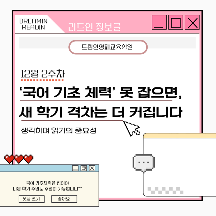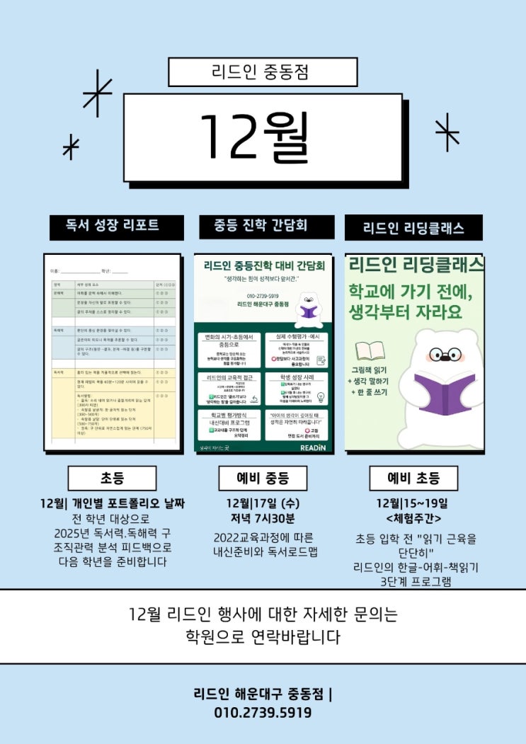 [리드인 해운대 중동점] 12월 예비초 리딩클래스 & 독서·중등 준비 프로그램 안내 (부산 예비초 준비 / 해운대 리딩클래스 / 초등 문해력 / 독해력 향상 / 예비중 내신 준비) 안녕하세요. 부산 해운대구 중동 리드인 해운대 중동점입니다 12월은 예비초 아이들의 입학 준비, 초등학생들의 문해력 점검, 예비중의 중등 내신 대비까지 학부모님들 문의가 가장 많은 시기입니다. 이번 달 리드인은 특히 예비초 리딩클래스에 집중하여, 아이들의 ‘읽기 근육’을 탄탄하게 만드는 프로그램을 준비했습니다. 1. 예비초 리딩클래스 체험주간 부산 예비초 문해력 / 해운대 리딩클래스 / 초등 입학 준비 필수 “학교 가기 전에 꼭 해야....... <img src="https://blogthumb.pstatic.net/MjAyNTExMjdfMjY1/MDAxNzY0MjAyNzI2Mzk0.T5BUWpTaYGdGvU8SLoD_ji6QaKwY5GQtD8ZGwOasfvEg.XolcXMD-ta7wgluMzaz3tgqZsDOCjqET5SqMMsDWXfEg.JPEG/900%A3%DF%C7%CF%B4%C3%BB%F6_%B1%F2%B2%FB%C7%D1_%B5%B5%BC%AD%B0%FC_%C0%CC%B4%DE%C0%C7_%C3%A5_%C3%DF%C3%B5%B5%B5%BC%AD_%BE%C8%B3%BB_%C6%F7%BD%BA%C5%CD.jpg?type=s3" />