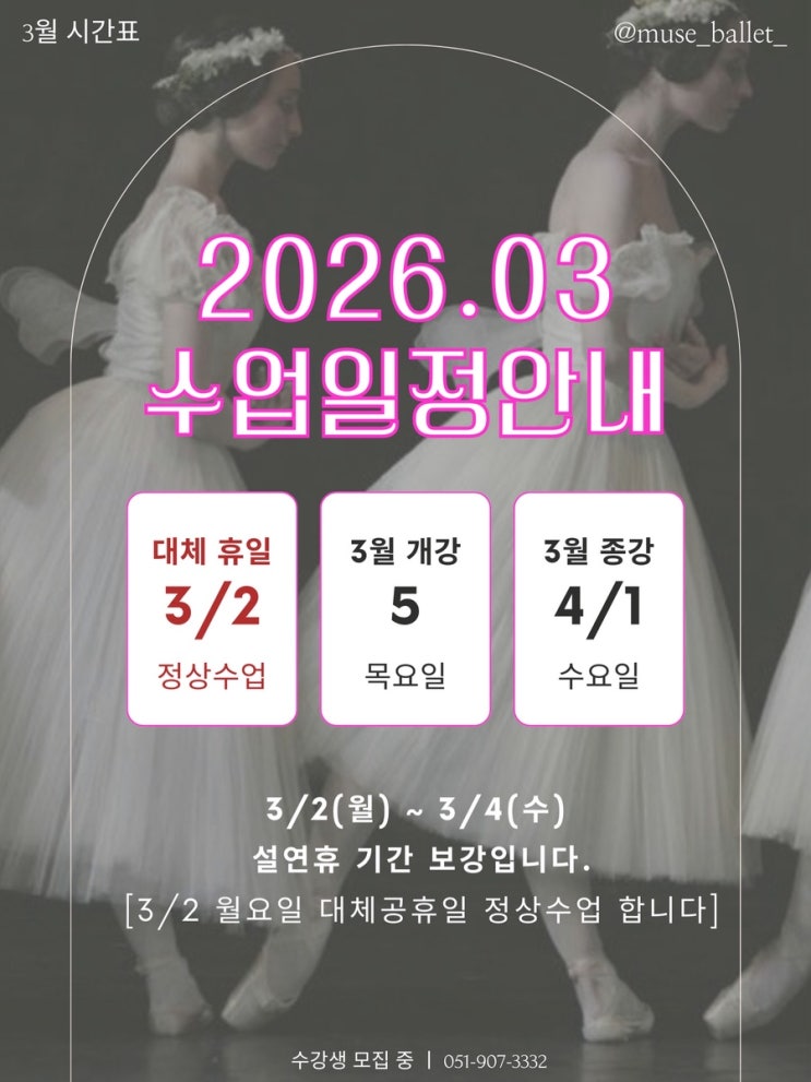 안녕하세요 ! 부산 금정구 장전동에 위치한 뮤즈발레학원 입니다! ✅3월 수업일정 시간표 올려둘게요 확인해주세요! ✅공지사항도 확인부탁드려요 ! • #뮤즈발레학원 #성인취미발레 #부산성인발레 • ✅예약없이 방문하신 경우는 당일 상담이 어려울 수 있습니다! 예약후 방문 부탁드립니다 ✅상담문의 - 카카오플러스 ’뮤즈발레학원‘ -051)907.3332 #부산발레학원#부산대성인발레#장전동성인발레#발레#발레학원#성인취미발레학원#부산발레#취미발레#직장인취미#직장인발레#성인발레#성인취미#자세교정#바른자세#운동#힐링#바레#barre#장전동발레#금정구발레#온천장발레#부산대발레#다리교정#우아한취미#성인취미발레#부산바레#성인발....... <img src="https://blogthumb.pstatic.net/MjAyNjAzMDdfMjQ2/MDAxNzcyODU3MDY5NTA3.tfJV1ANqczbhI9VEXWcbPiLA4iAey-fKD7NwscjpunEg.KNpTutCjm-bMNCQuIN99ibTmpeLUElGIxeLzb90UQncg.JPEG/4B70D8CC%A3%AD7588%A3%AD450F%A3%AD84B5%A3%AD113445ABF66D.jpg?type=s3" />