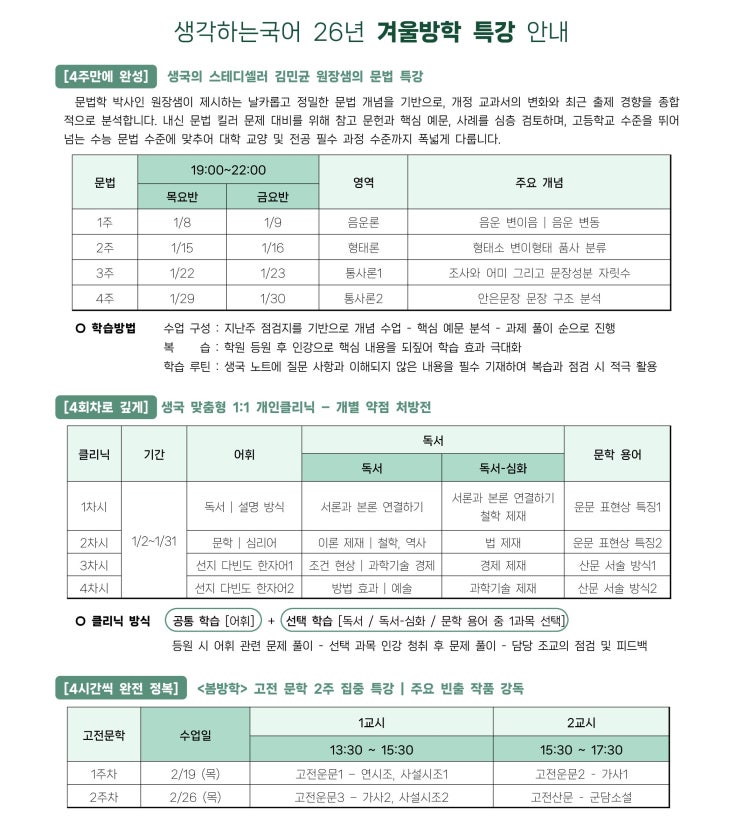 ※ 특강 시간표는 학원 사정에 따라 일부 변경될 수 있으며, 개강 전 최종 확정 시간표를 반드시 확인해 주시기 바랍니다. 등록 및 문의 안내 ● 등록 기간: 12/2(화)부터 선착순 마감 ● 상담/문의: 051-506-4595 (평일 14:00-21:00) 이번 겨울방학, 생각하는 국어 특강과 함께 2026학년도 성공적인 입시를 위한 단단한 기초를 마련하세요 :) 감사합니다. <img src="https://blogthumb.pstatic.net/MjAyNTEyMDJfNTYg/MDAxNzY0NjY0Mjk5MzAw.0geGNoi5w6fTsTMd5HDpazZf64waVz9z4LkzEBbEMDQg.AGa314Bh6o08IsMxIvGvGUTthTrjMCt8knu_FkpwnAEg.JPEG/2026_%B0%DC%BF%EF%B9%E6%C7%D0_%C4%BF%B8%AE%C5%A7%B7%B3_%28%BC%F6%C1%A4%29.jpg?type=s3" />