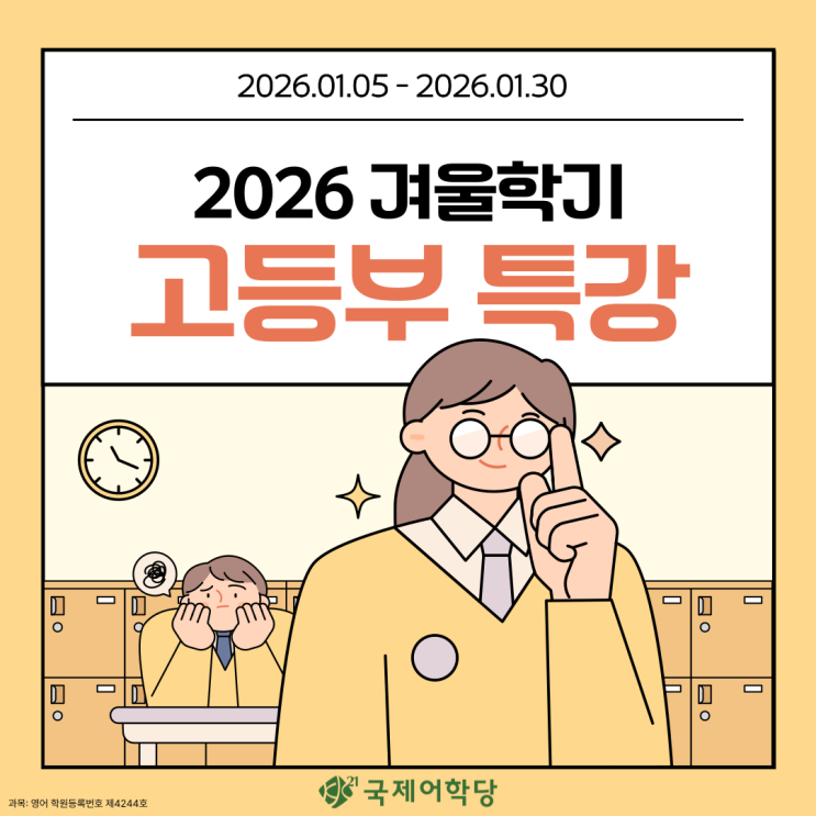 아침 저녁으로 겨울 기운이 느껴지는 요즘, 차가운 바람속에서 새로운 한 해가 다가오고 있음을 느끼게 됩니다. 국제어학당 본원은 더운 알찬 내용으로 준비된 2026년 겨울학기 고등부 특강 소식으로 인사드립니다! 내신 문법, 수능 독해.. 도대체 어디서부터 시작해야 할까? 이 고민, 국제어학당 본원이 확실하게 해결해드립니다! 짧지만 중요한 겨울방학 기간, 학생들이 많은 계획을 세우고 있겠지만 영어 실력의 단단한 기본기를 만드는 데 겨울방학만큼 좋은 시기는 없습니다. 방학기간동안 내신뿐만이 아니라 수능에 대한 감각을 익힐 수 있는 좋은 기회! 이번 겨울방학, 국제어학당 본원이 영어 실력을 올려줄 가장 확실한 방법입니다! 학....... <img src="https://blogthumb.pstatic.net/MjAyNTEyMDlfMjc2/MDAxNzY1MjU5MjEzOTAy.wHJb5XDTh7Sxzwjwxl3k6LUKbR7O84Gdka69QffQ3A8g.juJl-8QvdiK6GOKRp4r5VQ205z-ljU3DPpXMrICevn4g.PNG/001.png?type=s3" />