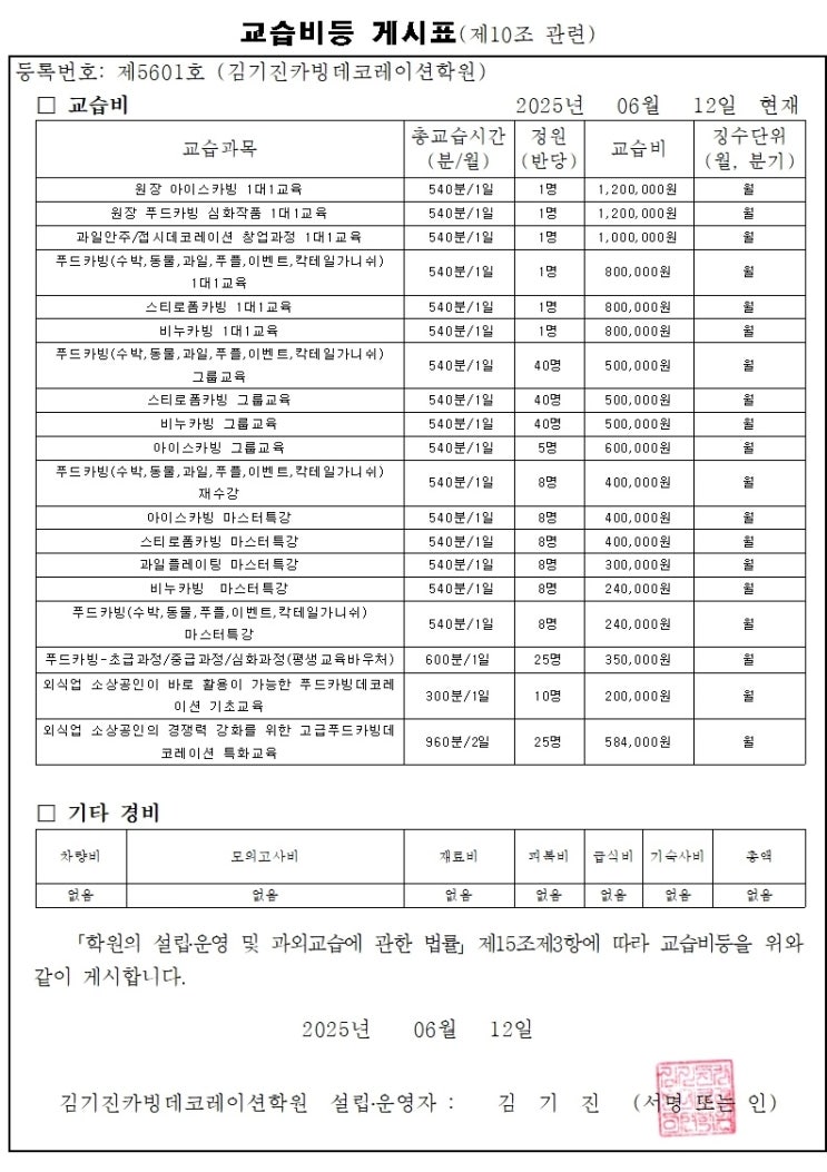 김기진카빙데코레이션학원_교습비 게시표