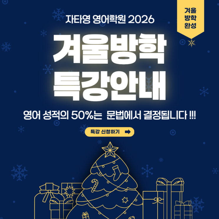 ❄️겨울방학 영어문법 특강 안내 매주 금요일 오후 1:00–3:30 / 2시간 30분 집중 수업!!! 겨울방학은 영어 실력을 단숨에 끌어올릴 수 있는 가장 좋은 시기입니다. 하지만 문법을 혼자 공부하려 하면 막히고, 헷갈리고, 결국 포기하게 되는 경우가 많죠. 그래서 이번 겨울방학에는 “기초부터 시험 대비까지 한 번에 정리하는 영어문법 특강” 을 준비했습니다. ✨ 자타영 문법 특강 특징 ✔ 1. 매주 금요일,2시간 30분 바쁜 겨울 일정 속에서도 부담 없이 참여할 수 있는 효율적인 구성입니다. ✔ 2. 헷갈리는 핵심 문법을 주제별로 완전 정리 시제, 조동사, 준동사, 관계사, 비교급, 가정법 등 학교시험·내신에서 자주 출제되는 핵심만....... <img src="https://blogthumb.pstatic.net/MjAyNTEyMDNfMjYx/MDAxNzY0NzYyNDkwOTg2.mc5G0cdwqa1B96zwpIVL2bH8cOxnRnTmeSSPPYAG4VMg.u2Z7Q03QxUGOUZBkNDXhM2OCjuPXdzFLOOsgZmWbLjog.PNG/001.png?type=s3" />