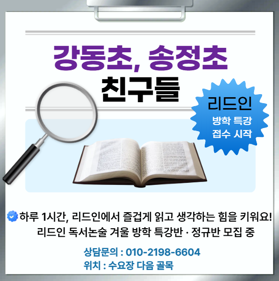 방학 동안 우리 아이 독서 습관, 어떻게 잡아주실 건가요? 방학은 아이에게 단순히 공부에서 벗어나는 ‘쉬는 시간’이 아니라, 스스로 생각하고 성장할 수 있는 가장 좋은 기회이기도 합니다. 학기 중에는 숙제와 일정에 쫓기다 보니 책 한 권을 온전히 읽기 어렵지만, 방학에는 마음의 여유를 가지고 책과 친해질 수 있죠. 이 시기에 읽은 책 한 권은 단순한 지식이 아니라 생각의 깊이를 넓히고, 새로운 시각을 열어주는 ‘성장의 씨앗’이 됩니다. 꾸준히 책을 읽는 습관은 방학이 끝난 후에도 아이의 학습 태도와 사고력에 큰 차이를 만들어줍니다. 짧은 시간이더라도 매일 꾸준히 책을 읽는 아이는, 결국 스스로 배우고 성장하는 힘을 갖게....... <img src="https://blogthumb.pstatic.net/MjAyNTExMTFfMTAx/MDAxNzYyODYzMjIxNTky.pgrdYHUmtUth4lM0FSCBxmG0Bs_O1PRWABQHzJNdB_Yg.9jjfm7puWuZ0a2X7CFT_fh2WKeXL0FZbE3_EkwauczIg.PNG/KakaoTalk_20251111_173109927.png?type=s3" />