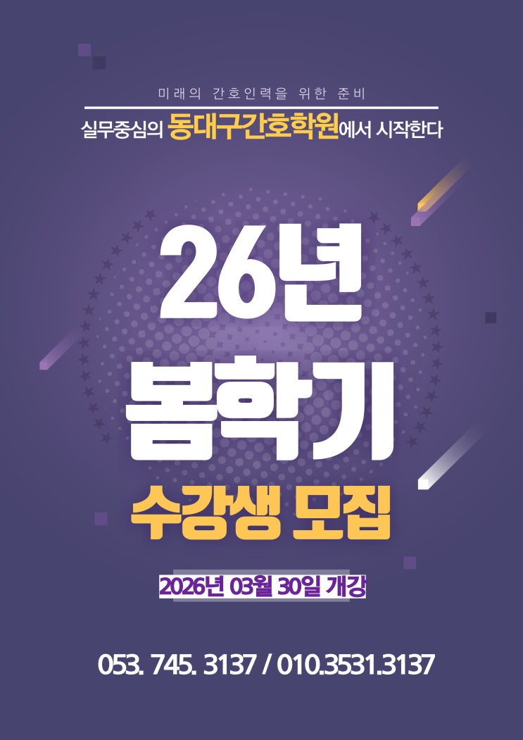 가을비가 내려 잠깐 쌀쌀하더니 이내 청명한 가을 하늘을 보이는 11월의 마지막 금요일예요~ 안녕하세요 대구대표간호학원 동대구간호학원의 DNA예요 가을학기 입학했던 22기 수강생들은 현장실습을 시작한 한 주 였고 봄에 입학했던 21기 수강생들은 현장실습 마치고 이론 막바지 준비를 위해 학원으로 복귀해서 열공을 하며 11월을 마무리 짓습니다 연말이 다가오니 벌써 내년을 준비해야함을 느껴요 그 래 서 대구대표간호학원 동대구간호학원에서는 26년 봄학기 신입생을 모집합니다 26년 봄학기는 2026년 3월 30일 부터 2027년 3월 5일까지 수강기간예요 이론 740시간, 현장실습 780시간을 이수하려면 좀 바쁘죠~^^ 1년의 기간이 망설여지시....... <img src="https://blogthumb.pstatic.net/MjAyNTExMjhfNjcg/MDAxNzY0MzEwNTY0Njgx.GoEY5z80-rJ4WXUwEO0PpjRwhn8aCgAEMCZhUd7WRBwg.d9B3gmZv61o3Hh1BcIqXerQM-8ISVHKEasSPNKtnuAsg.JPEG/%C1%A6%B8%F1%C0%BB_%C0%D4%B7%C2%C7%D8%C1%D6%BC%BC%BF%E4_%281%29.jpg?type=s3" />