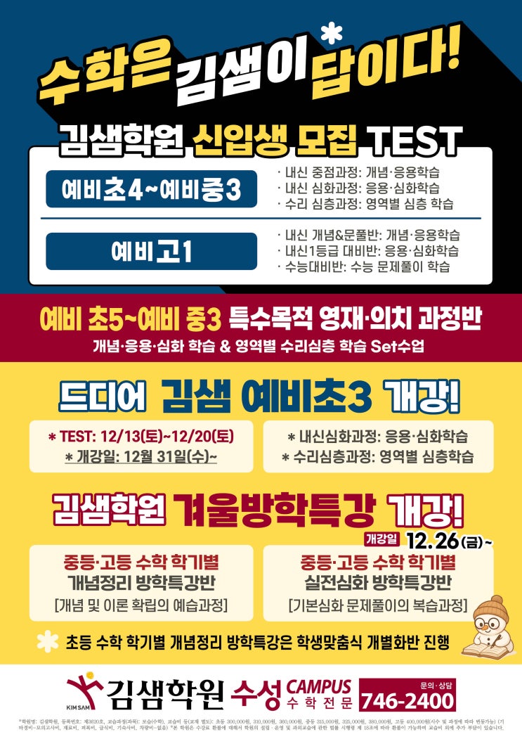 대구 수성구 수학학원 만촌동 수학학원 김샘학원 수성캠퍼스 수학은 김샘이 답이다! 김샘학원 신입생 모집 TEST ✨<예비초4~예비중3>✨ · 내신 중점과정: 개념·응용학습 · 내신 심화과정: 응용·심화학습 · 수리 심층과정: 영역별 심층 학습 ✨<예비고1>✨ · 내신 개념&문풀반: 개념·응용학습 · 내신1등급 대비반: 응용·심화학습 · 수능대비반: 수능 문제풀이 학습 ✨예비 초5~예비 중3 특수목적 영재·의치 과정반✨ 개념·응용·심화 학습 & 영역별 수리심층 학습 Set수업 ✨김샘 예비초3✨ * TEST: 12/13(토)~12/20(토) * 개강일: 12월 31일(수)~ - 내신심화과정: 응용·심화학습 - 수리심층과정: 영역별 심층학습 ✨김샘학원....... <img src="https://blogthumb.pstatic.net/MjAyNTEyMDRfMTYw/MDAxNzY0ODQyNDQwMjYy.6oqP68PX51apAqeB2tQNV58HALYhuEqWbSjUgfvHipog.X-q_OjWPzXDVTLBr5fQmGgSD9f_4uYR6lV_0LruuEXog.JPEG/20251126_%C4%A7%BB%EA%B0%DC%BF%EF%B9%E6%C7%D0%C8%AB%BA%B8%C0%FC%B4%DC.jpg?type=s3" />