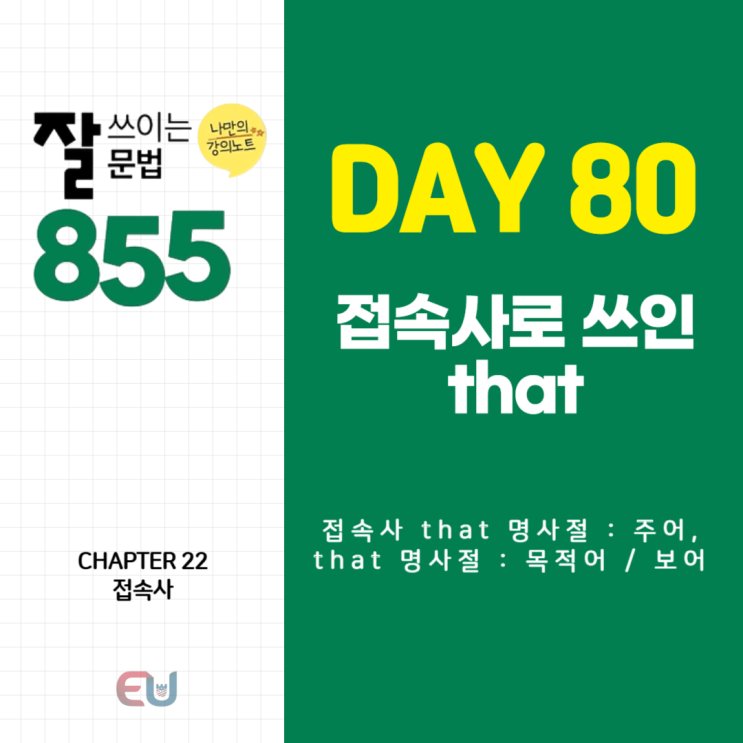 DAY80 접속사로 쓰인 that 오늘 배울 문법 포인트 - 접속사 that 명사절 : 주어로 쓰일 때, that 명사절 : 목적어로 쓰일 때, that 명사절 : 보어로 쓰일 때 지금 바로 영상으로 확인해보세요! Point1 접속사 that 명사절 : 주어로 쓰일 때 Point2 that 명사절 : 목적어로 쓰일 때 Point3 that 명사절 : 보어로 쓰일 때 #855영문법 #4권 #DAY80 #동호이유어학원 #쉬운영문법 #접속사 #that #주어 #목적어 #보어 #강동초 #동호초 #새론초 #강동중 #새론중 <img src="https://blogthumb.pstatic.net/MjAyNTExMjBfOCAg/MDAxNzYzNjMxNzM2Mzcw.DMWQWC6O2RW0mEDzuZPLqfpjlppSgx4w14LsENzdktQg.F3IOjCZDwR8cTA_NNoMFcmUOeRkHwCVLA3DQjnaHR9wg.PNG/%C1%A6%B8%F1%C0%BB_%C0%D4%B7%C2%C7%D8%C1%D6%BC%BC%BF%E4_-047.png?type=s3" />