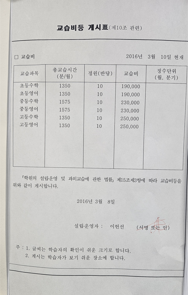 < 학원 교습비 등 관련 규정에 따른 표시 사항 >
