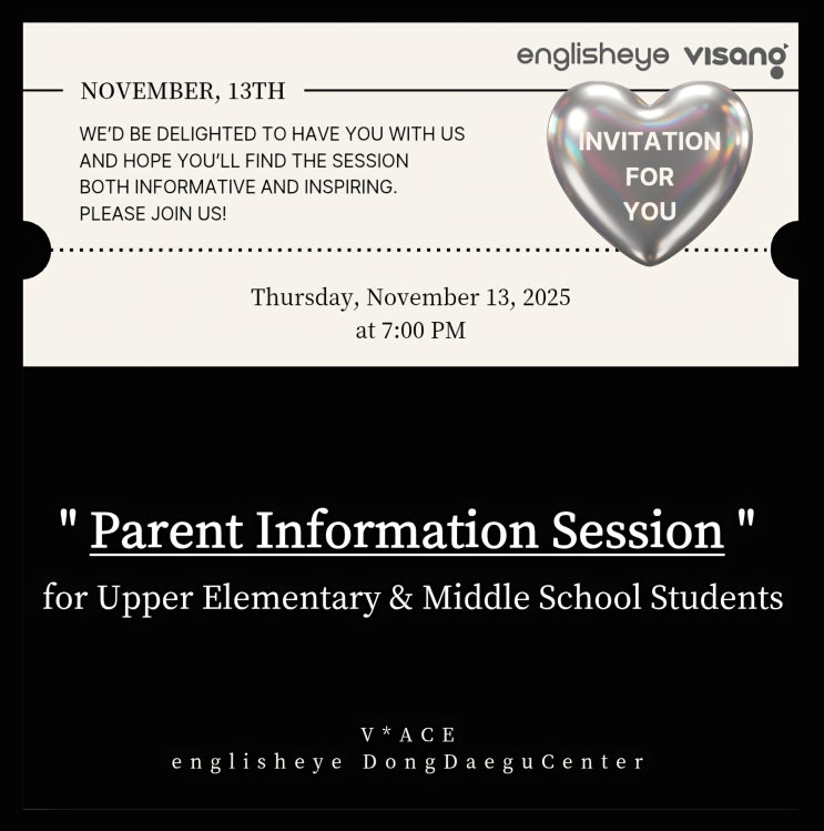 안녕하세요 :) 작은 성장이 모여 큰 실력이 되는 공간, 여기는 잉글리시아이 동대구센터점 영어학원입니다 ⭐ 요즘 날씨가 제법 쌀쌀해졌죠? 가을이 깊어가는 만큼, 우리 학원에서는 아주 뜻깊고 열기 가득한 시간을 가졌답니다 바로바로...!! ✨ 초등 고학년 학부모 초청 간담회 ✨ 아이의 중학교 진학을 앞두고 "중등을 앞둔 우리 아이, 개정되는 교육, 앞으로의 방향성은?" "사춘기 아이와 어떻게 소통해야 할까?" 고민 많으셨던 우리 어머님들을 모시고 간담회를 가졌답니다~ 이번 간담회에서 강사님이 가장 강조하신 부분은 바로 바로~ " 변화와 방향성 " 과거에는 70~80% 이상을 차지하던 객관식 선택....... <img src="https://blogthumb.pstatic.net/MjAyNTEyMDFfMjEz/MDAxNzY0NTU3MDYxMjg4.oFix4yqoPTHpqYebPeU4GzIuQHYa5oZwOS3_Vl3dY-Yg.4aJ2oT83GBEDERTJKsTCJSVFvR-7hlbMB3PwXEN62Rsg.JPEG/KakaoTalk_20251125_181135547_18_%281%29.jpg?type=s3" />