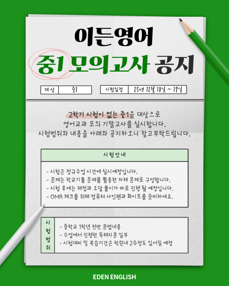 안녕하세요, 이든영어 입니다 :) 쌀쌀한 날씨와 함께 다가오는 중학교 2학년 과정을 앞두고, 현재 중학교 1학년 학생들을 위한 이든영어 자체 모의고사 실시를 안내해 드립니다. 본 모의고사는 단순한 평가를 넘어, 개별 학생의 정확한 학업 수준을 진단하고, 향후 학습 로드맵을 구체적으로 설계하기 위한 필수적인 과정이므로, 중학교 1학년 학생 전원이 참여하게 됩니다. 왜 지금, 이 모의고사를 실시해야 할까요? 중학교 1학년 과정은 초등학교 과정의 영어를 문법을 활용하여 점검하는 시기입니다. 그러나 중학교 2학년부터는 학기마다 정기고사가 본격적으로 도입되며, 난이도가 한 단계 상승합니다. 특히 고등학교 내신 및 수능에서....... <img src="https://blogthumb.pstatic.net/MjAyNTExMjZfMjg4/MDAxNzY0MTU1MzcwMzQ5.Aw2Zh62rFguXgDi1QY_tHCmLoS0v2OYNZY-y_anrdg8g.GPRi0o_CwXBhDoO5LAp_34QWdwJe0HFV-gYbdq9uKdcg.PNG/%C1%DF1_%B8%F0%C0%C7%B0%ED%BB%E7.png?type=s3" />