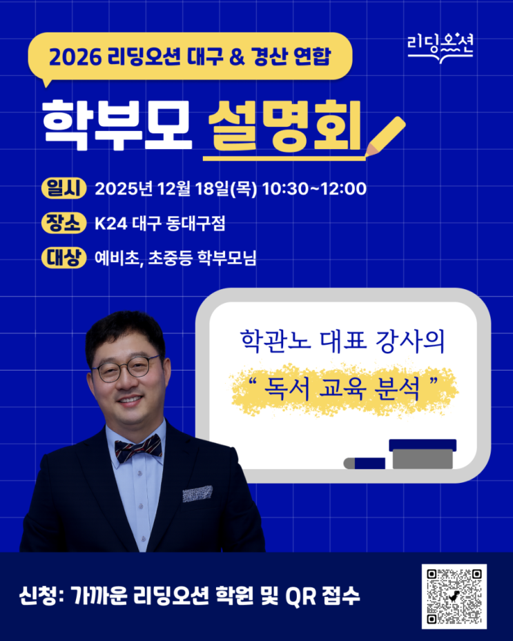 안녕하세요~ 리딩오션 대구율하점입니다. 갈수록 독서 교육에 대한 중요성이 커지는 지금! 대구&경산 학부모님들에게 좋은 소식이 있습니다. 바로, 성적 상승으로 이어지는 독서 교육에 대한 강의와 함께하는 학부모 설명회입니다. 참여를 원하시는 분은 아래의 링크를 통해 신청해주세요. 유익한 시간이 될 예정이니 많은 참여 부탁드립니다~ :) 리딩오션 대구 경산 설명회 <img src="https://blogthumb.pstatic.net/MjAyNTEyMDVfMzQg/MDAxNzY0OTE0MTg2MDQy.VVfrNE7hItTIvT8xb1zGxvucXqQguzGYRjxHhRuNvK8g.mFmi6FW4r9CKK48bSK8_SHcLHCPgGyztWuuHJvWear0g.PNG/%28%C4%AB%B5%E5%B4%BA%BD%BA%29_%B4%EB%B1%B8_%C7%D0%BA%CE%B8%F0%BC%B3%B8%ED%C8%B8.png?type=s3" />