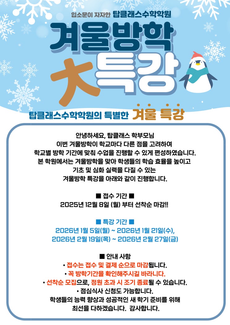 안녕하세요, 탑클래스 학부모님 이번 겨울방학이 학교마다 다른 점을 고려하여 학교별 방학 기간에 맞춰 수업을 진행할 수 있게 편성하였습니다. 본 학원에서는 겨울방학을 맞아 학생들의 학습 효율을 높이고 기초 및 심화 실력을 다질 수 있는 겨울방학 특강을 아래와 같이 진행합니다. ★접수는 다음주부터 받겠습니다~!!!★ << 특강 기간>> 2026년 1월 5일(월) ~ 2026년 1월 21일(수), 2026년 2월 19일(목) ~ 2026년 2월 27일(금) << 안내 사항>> ■ 접수는 접수 및 결제 순으로 마감됩니다. ■ 꼭 방학기간을 확인해주시길 바라니다. ■ 선착순 모집으로, 정원 초과 시 조기 종료될 수 있습니다. ■ 점심식사 신청도....... <img src="https://blogthumb.pstatic.net/MjAyNTEyMDhfMTgg/MDAxNzY1MTcyNTYxNDU2.mEYY5V4_uGceeW2FTG7Y_pf0TRjrrl368VwDUtsNd5cg.4qguAMkcgU8BMXHaJVh86lo7A-nb4AtNlVU1VJ0f9_gg.JPEG/%B0%DC%BF%EF%C6%AF%B0%AD%BC%F6%C1%A4%BA%BB.jpg?type=s3" />
