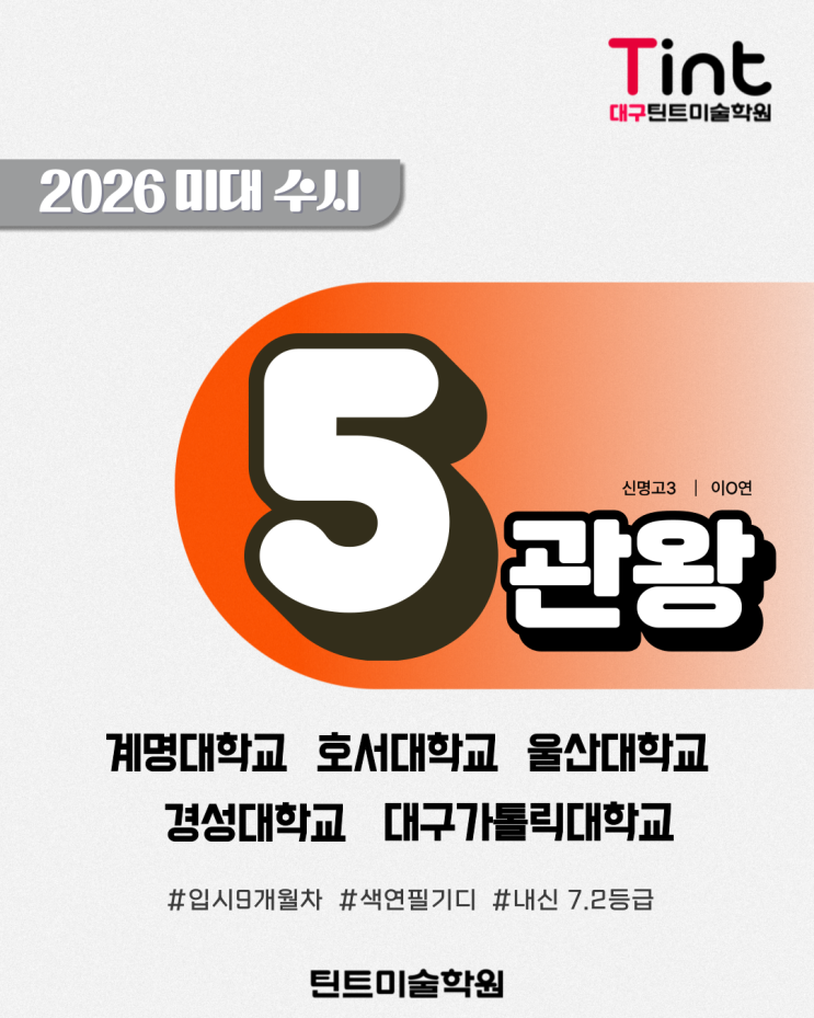 안녕하세요. 대구 틴트미술학원입니다. 26학년도 미대 수시 5관왕 달성 소식을 전해드립니다. 단 9개월의 기간이었지만 그 시간의 밀도는 어느 학생보다 높았습니다. 지각 한 번, 결석 한 번 하지 않고 치열하게 9개월을 꽉 채운 결과, 짧은 경력과 낮은 성적임에도 당당히 원하는 학교에 합격할 수 있었습니다. 특히 입시기간이 짧았기에, 시간이 오래 걸리는 물감보다는 색연필과 마카를 사용한 그림에 집중한 것이 맞았음을 결과로 증명하였습니다. 올바른 방향의 입시 지도와 학생의 성실함이 만난다면 입시 결과는 성공적일 수밖에 없습니다. 학생의 새로운 시작을 진심으로 응원하며, 더 좋은 결과로 보답하는 대구 틴트미술학원이 되겠습....... <img src="https://blogthumb.pstatic.net/MjAyNTEyMDZfMjY3/MDAxNzY1MDIwMTAwMzc3.QhsPeId_WHRjHe5Bym07G81XaWPX3TCgHAjG26DzzYcg.77xYjEIG2EdVYQmxULEF3ZODsySMifp-f9pKQk-gWUQg.PNG/%C1%A6%B8%F1%C0%BB-%C0%D4%B7%C2%C7%D8%C1%D6%BC%BC%BF%E4_-001_%282%29.png?type=s3" />