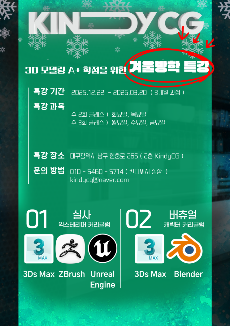 3Ds Max, ZBrush, Blender 겨울방학 특강! 겨울방학을 보람차게 보낼 특별한 강의를 준비했어요! 실제와 같은 익스테리어 모델링 부터 귀엽고 예쁜 버츄얼 캐릭터 제작까지! KindyCG에서 함께 시작해봐요! https://cafe.naver.com/kindycg/696 <img src="https://blogthumb.pstatic.net/MjAyNTEyMDhfMTcz/MDAxNzY1MTc0Mjk3OTg2.7De0QCP0uNriS2ER2t483fvZlHBA9JwpQJbDhsX1wFsg.seJUHspKaiULTtnRiT0Djig-0L7YONy0d4hSWCmyJzwg.PNG/2026_%B0%DC%BF%EF%B9%E6%C7%D0_%C6%AF%B0%AD.png?type=s3" />