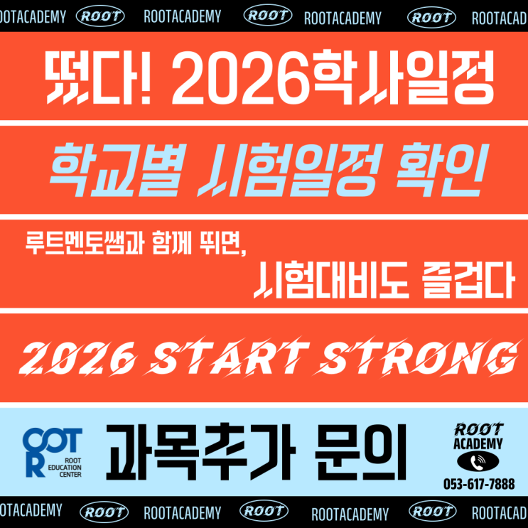 2026년 초등 · 중등 · 고등 학사일정 총정리 시험 대비 잘하는 학원은 준비가 다릅니다 안녕하세요. 대구 테크노폴리스 루트학원입니다. 많은 학부모님들이 상담 때 이런 질문을 하십니다. “시험 대비는 언제부터 시작해야 하나요?” “중간고사는 보통 언제쯤인가요?” 사실 시험 대비는 시험 직전에 시작하는 것이 아니라 학사일정을 미리 알고 준비하는 것이 가장 중요합니다. 그래서 오늘은 2026년 초등학교 · 중학교 · 고등학교 학사일정 흐름과 시험 대비 전략을 정리해 드리겠습니다. 2026 학사일정 비슬초·유가초·테크노초·포산초·유가초 2026년 학사일정 핵심 흐름 3월 ✔ 새 학년 시작 ✔ 학습 수준 차이가 가장 크게 나타나는 시기 ?....... <img src="https://blogthumb.pstatic.net/MjAyNjAzMTRfNDUg/MDAxNzczNDYxMDc2NDc2.pDUPtWhZMkMhMZ2XTyHrOuHIHOnGKcZ5xWw91mkEDp4g.j81JPRbM8iIpAUw-qV9XL39aZr39anLNJCPKxH-pjLgg.PNG/%C1%DF%B0%A3%B0%ED%BB%E7_%C7%D0%B1%B3%BA%B0_%B3%AF%C2%A5_%C4%BF%B9%F6.png?type=s3" />