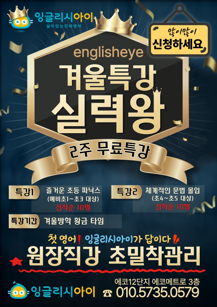 이제 각 학교들의 졸업식, 종업식이 한달도 안 남은 시점입니다. 겨울 방학은 여름 방학보다 기간이 길기도 하지만 개학 후 새학년이 시작된다는 점에서 여름 방학보다 더욱 특별한 학습 관리가 필요합니다. 그래서 이번에 비상에서는 영어를 막 시작하려는 예비 초등생 및 저학년생을 위한 phonics 특강과 이제 초등 영어 학습에 한창 심화되어 서서히 문법을 접해야 할 시기가 온 예비 고학년생들을 위해서 문법 특강을 준비했습니다. 이번 방학 특강은 'englisheye 겨울방학 실력왕' 이라는 제목으로 2주간 무료 수업으로 진행하여 영어 수업에 대한 문턱을 많이 낮추었습니다. 물론 수업은 영어교육 전문가 비상의 원장 직강으로 진....... <img src="https://blogthumb.pstatic.net/MjAyNTEyMTJfMjY5/MDAxNzY1NTM0NDQ1MjA2.mt4MBz_zSsnSKIQdgUW2VgYu-_UZk2ppEvUDd4K_EVsg.PNHVVqgw6JaEUE0l3arGM2jo236Jw5y-HWDv-JQ7ROcg.JPEG/KakaoTalk_20251212_185620123.jpg?type=s3" />