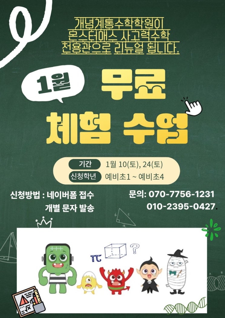 2026년 1월 개념계통수학학원이 몬스터매스 사고력수학 전용관으로 리뉴얼 됩니다. 계통수학 수업은 그대로 진행됩니다. 6~7세부터 시작되는 몬스터매스 교구 사고력 수업과 개계수만의 비법 연산 Logic Tree 수업이 접목된 특화된 수학 수업을 만나실 수 있습니다. 체험 수업 신청 접수는 아래 네이버 폼으로만 받습니다. 몬스터매스 사고력수학 부개교육원 체험 수업 신청서 - 네이버 폼 <img src="https://blogthumb.pstatic.net/MjAyNTEyMzBfMjQ5/MDAxNzY3MDc0NTk3MzAy.a0gPTb5OyUyz0FVBZ4F8wi-eQS1Txb0XM1EqOazQVsgg.WTwwF1iJSlC-pS7oxJ2eCh5BGkqcEQaFRnfMeOWzNWgg.JPEG/%B8%F3%BD%BA%C5%CD%B8%C5%BD%BA%C3%BC%C7%E8%BC%F6%BE%F7%BE%C8%B3%BB.jpg?type=s3" />