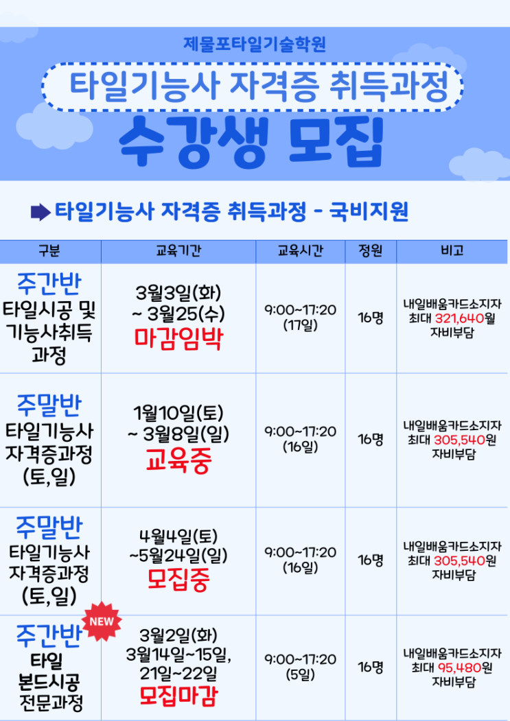 저희 제물포타일기술학원에서는 재직자, 근로자, 실업자, 구직자,내일배움카드 소지자를 위한 "국비지원 자격증 취득과정" 을 아래와 같이 운영하고 있습니다. ※ 실제 자비부담금은 수강생의 유형에 따라 다를 수 있습니다. <img src="https://blogthumb.pstatic.net/MjAyNjAyMTlfMzkg/MDAxNzcxNDU4NTQ0OTc5.uFwaEGjTmBRvIiFJxOjCaO5s8FjhoiVhQQ_L0s_y8VMg.WuuoebEi0TQ6YHhVg7YSsaRlyAjsx5pm7kNTwngpfAUg.PNG/%C5%B8%C0%CF%B1%E2%B4%C9%BB%E7-%BC%F6%B0%AD%BB%FD%B8%F0%C1%FD-001_%288%29.png?type=s3" />