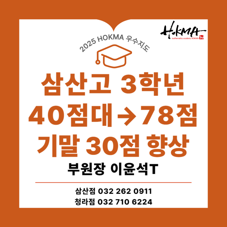 안녕하세요. 삼산동 수학학원, 호크마수학학원입니다. 고3이 되면 이제는 더 이상 떨어지면 안 된다는 부담감이 성적보다 먼저 학생을 짓누르곤 합니다. 하지만 공부의 방향과 관리가 다시 맞춰진다면, 성적은 생각보다 빠르게 반응하기도 하죠. 오늘은 중간고사 대비 기말고사 점수를 31점 끌어올린 삼산고등학교 3학년 편OO 학생의 이야기를 통해 삼산동 수학학원 호크마 부원장 이윤석 선생님의 고3 우수지도 사례를 함께 살펴보려 합니다. Problem 삼산고등학교 3학년 편OO 학생은 고교 입학 후 수학에 어려움을 느껴 부원장반으로 전반한 학생이었습니다. 전반 이후 성적이 눈에 띄게 오르며 자신감을 되찾았지만, 2학년 2학기 무렵 다시 한....... <img src="https://blogthumb.pstatic.net/MjAyNjAyMjdfNjMg/MDAxNzcyMTU3NzQ1MDE5.GUQVCWgG5DXW6nb6Xt6K71QFwU01HBwXKgNoJulMmV0g.jKfJaQtxYQMH6ojCY44QTcLDTDO2taq5Mz5RYGl5-7Yg.PNG/%BB%EF%BB%EA%B0%ED_3%C7%D0%B3%E2_%B1%E2%B8%BB30%C1%A1_%BB%F3%BD%C2%BB%E7%B7%CA_%C0%CC%C0%B1%BC%AEt-001.png?type=s3" />