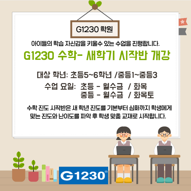 2026년도 새 학기가 시작 합니다. 새 학년 새 학기 진도 시작반 및 학생별 개별 진도반 학생을 모집하고 있습니다. 초등 : 월수금 3:50~6:00 / 화목 3:40~6:00 중등 : 월수금 5:30~8:00 / 월수금 7:30~10:00 화목 5:30~8:00 . 토:10:00~12:30 / 화목 7:30~10:00 . 토:12:00~2:30 ◆ 학생의 학습 상태를 진단한 뒤, 개인별로 진도와 심화 수준을 조정하는 맞춤형 커리큘럼 ◆ 중고교 수학 1등급 목표로 각 영역에 대한 체계적인 학습 방법 제시 ◆ 학생 개인의 학습 수준과 목표에 맞춘 1:1 개별 맞춤형 수업 시스템 및 레벨에 따른 판서 수업 진행 ◆ G1230 수학과 관리 방안 ◆ ▶인증 TEST : 매시간 수업 내용 확인 진도 진행 상황 및 선 진도....... <img src="https://blogthumb.pstatic.net/MjAyNjAyMjdfMTAy/MDAxNzcyMTgwNjA0NjY3.TJ5eknR5UOdgcG9LF4Pai4_e-ftW6eFs9bOf7_EqlSQg.X-7r1dcVLGtf-HiF7Uk4roFF65_EAQGcYjxXk86PFhcg.PNG/%C3%CA%C1%DF%B5%EE%BC%F6%C7%D0.png?type=s3" />