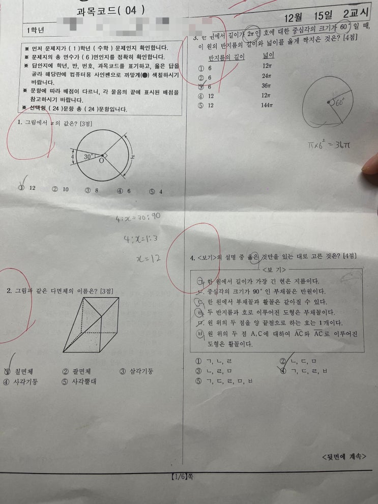 인천 운서중 1학년 2학기 수학 기말고사 기출 손풀이