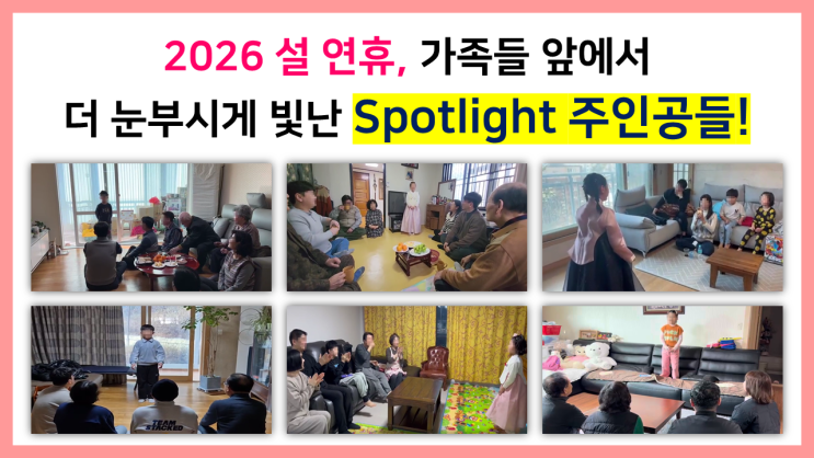 설 연휴 기간 동안 진행된 [Spotlight Rehearsal 설 연휴 이벤트]에 적극적으로 참여하고, 멋진 후기 영상을 보내주신 모든 학부모님과 학생들에게 진심으로 감사드립니다. ✨ 설 명절, 거실을 무대로 만든 용감한 주인공들 명절 연휴에도 발표 내용을 잊지 않고 연습하여, 할아버지, 할머니, 부모님 앞에서 자신감 있게 영어 실력을 뽐낸 우리 친구들의 열정에 큰 박수를 보냅니다! ✨ 마켓 쿠폰 혜택 안내 제출된 영상들은 완벽 암기 여부를 확인 후, 5월 Market Day에서 사용 가능한 마켓 쿠폰 1,000달러가 증정될 예정입니다. 앞으로도 정상어학원은 아이들의 실력 향상과 자신감 고취를 위해 최선을 다하겠습니다. 꾸준한 관심과 참여 부탁....... <img src="https://blogthumb.pstatic.net/MjAyNjAzMTJfNCAg/MDAxNzczMzA1Mzc4MjE3.wyqczJ-2rjQJFICjOSmVwTtxECI3k07UkTZSN5FupqUg.X6pi64sLqHBGaX8EwJcaHA3jCZhQ0OQ28s5WXfhN8l0g.PNG/%BD%BD%B6%F3%C0%CC%B5%E51.PNG?type=s3" />