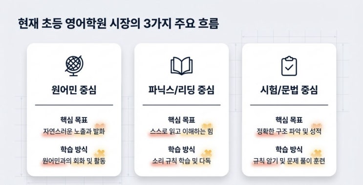 초등 영어 상담을 하다 보면 학부모님들이 가장 많이 하시는 질문 중 하나가 있습니다. “어떤 영어학원이 우리 아이에게 맞을까요?” 요즘은 영어학원의 종류도 정말 다양합니다. 원어민 수업을 강조하는 곳도 있고, 파닉스와 읽기 중심으로 수업하는 곳도 있으며, 시험과 문법을 중심으로 하는 학원도 있습니다. 그래서 학원을 알아보는 부모님들 입장에서는 선택이 더 어려워지는 것 같습니다. 실제로 상담을 하다 보면 많은 부모님들이 비슷한 고민을 하십니다. 초등 영어학원을 선택할 때 부모님들이 가장 많이 고민하시는 몇 가지 부분을 정리해 보았습니다. 1. 우리 아이에게 맞는 수업 방식인가 영어학원을 알아보실 때 가장 먼저 생각해....... <img src="https://blogthumb.pstatic.net/MjAyNjAzMTJfNzcg/MDAxNzczMjQ0MzMzNzc1.CKzxrTzvuRTWrTL6CS1jZMLfBTct40uPQMp-z2NTs1Ug.v6m11teaumgzk6mnFdMaukzE98KdcVQcAHo6Kodqnzog.JPEG/1.JPG?type=s3" />