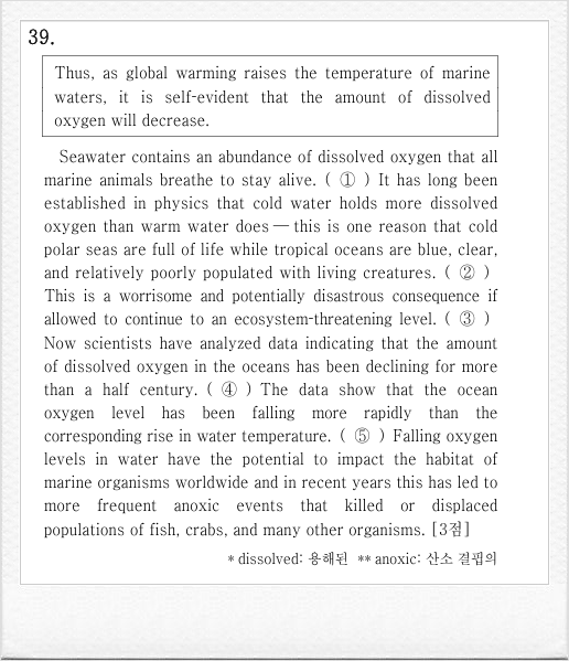 안녕하세요! 대전 학생들의 영어 성적을 책임지는 에릭쌤입니다. 오늘은 우리 친구들이 독해 문제를 풀다가 은근히 자주 마주치는 과학 관련 지문을 하나 가져와 봤어요. 문과 친구들은 머리 아프다고 넘기지 말고, 이과 친구들은 아는 내용이라고 방심하지 말고 저랑 딱 3분만 집중해 볼까요? 오늘 살펴볼 내용은 물리학에서 이미 정립된 이론, 바로 용존산소에 대한 이야기예요. 지문을 보면 차가운 물이 따뜻한 물보다 더 많은 용존산소를 가지고 있다는 내용이 나옵니다. 자, 여기서 우리가 꼭 챙겨가야 할 핵심 문법 포인트가 두 가지 있어요. 첫 번째는 바로 과거분사(PP)의 쓰임입니다. 지문에 Dissolved Oxygen이라는 표현이 나오죠? 여....... <img src="https://blogthumb.pstatic.net/MjAyNjAxMjdfMjAy/MDAxNzY5NDU0OTQ3NTc3.ABRuc2VdzDq59mRRNn0tj1lWp5zJew1eVh4tgcHH5xsg.H60WFcE0Hdqan1W2SgY9Lq1s1HXuzw8Uc4IZewi6eGMg.PNG/image.png?type=s3" />