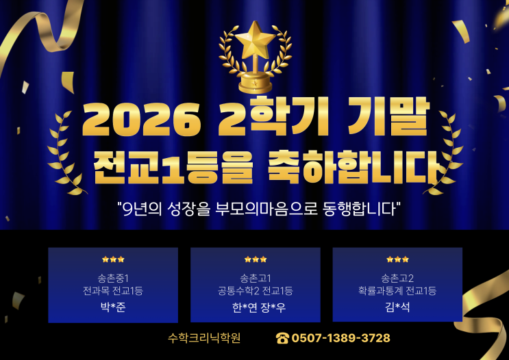 안녕하세요, 수학크리닉학원입니다 ^^ 지난 명문대 합격 소식에 이어 https://blog.naver.com/mathclinic_academy/224143963128 이번 기말고사 내신에서도 정말 기쁜 소식이 이어졌습니다. 많은 학생들이 기대 이상의 성과를 보여주었습니다. 전교 1등은 결코 쉬운 일이 아닙니다. 단 하나의 실수도 허용되지 않는 자리이기에 그 의미가 더욱 큰데요, 이번 시험에서 학년별로 고르게 전교 1등을 배출할 수 있었습니다. 정말 정말 축하합니다 열심히 노력해준 고등학교 1학년 학생들, 쉽지 않은 1등급을 무려 10명이나 달성해 주었습니다. 2학년에서도 꾸준히 1등급을 유지할 수 있도록 끝까지 함께 달려봅시다. 화이팅 중등 수학에서도....... <img src="https://blogthumb.pstatic.net/MjAyNjAyMDNfMTY3/MDAxNzcwMTE5NTM0MzI1.YD9_0I88_r98AsGjGbH8nzq54OMbTy79ResQrfOxZpwg.9-NV3aTC8eaPnckvum_2wJJDXpgN5mRpxMk16JKnQY4g.PNG/%BD%BA%C5%A9%B8%B0%BC%A6_2026-02-03_%BF%C0%C8%C4_8.52.07.png?type=s3" />