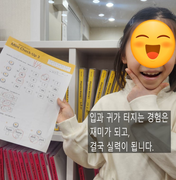 예비초 영어, 잘하고 싶다면 ‘파닉스’부터 점검하세요 초등학교 입학은 아이에게도 인생의 큰 사건이지만, 곁에서 지켜보는 어머니들께도 인생의 큰 변곡점이 됩니다. 유치원 때까지는 "그저 재미있게만 하면 되지"라고 생각하다가도, 예비초가 되는 순간 마음 한구석엔 "이번엔 정말 제대로 시작하고 싶다"는 간절함과 불안함이 동시에 찾아오곤 하죠. 이제 영어는 즐기는 놀이가 아니라, ‘잘해야 하는 과목’이 되기 때문입니다. 1. 아이가 책을 읽는 걸까요, 소리를 외운 걸까요? 많은 부모님이 영어 노출과 ‘흘려듣기’를 실천하십니다. 소리를 통째로 익히는 경험은 분명 중요합니다. 하지만 제가 현장에서 가장 안....... <img src="https://blogthumb.pstatic.net/MjAyNjAxMTJfMTk4/MDAxNzY4MTg5MjUzMDU3.edbd5YmrCYCbAZ-BktO3qbjadAd-u5XiYfYk37JV_SMg.FPkiI90N7FIh8CPtU-TZyQurtTaYYY7hhjAVL2ZCIuAg.JPEG/KakaoTalk_20260111_103536522.jpg?type=s3" />