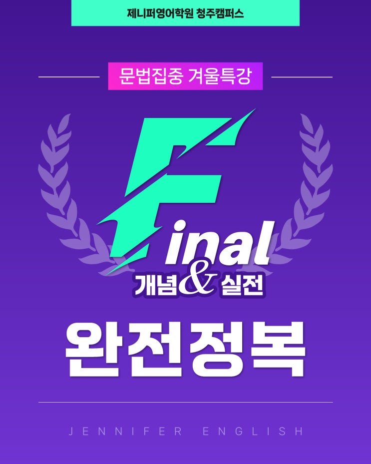 안녕하세요! 제니퍼영어학원 청주캠퍼스입니다 어느덧 2025년도 끝자락을 향해 달려가고 있습니다. 우리 제니퍼의 중학교 3학년(예비 고1) 학생들에게는 지금 이 시기가 그 어느 때보다 중요하고 떨리는 시기일 것입니다. 이제 '중학생'이라는 꼬리표를 떼고, 더 넓고 치열한 '고등학생'의 세계로 나아가야 할 때입니다. 고등 영어는 중등 영어와는 차원이 다른 어휘량과 복잡한 문법, 그리고 긴 지문을 요구합니다. 그래서 준비했습니다. 겨울방학, 예비 고1의 운명을 바꿀 [중3 전용 문법집중 겨울특강]을 소개합니다! ❄️ Final 개념 & 실전! [중등 문법 완전 정복] 이번 겨울특강의 핵심은 'Final(파....... <img src="https://blogthumb.pstatic.net/MjAyNTExMjdfMSAg/MDAxNzY0MjAzNzY3NjY3.P5wwl86gLKbRIBJDx4VM6bjoYpID6CwrLUIGrjFnLLAg.RcBzLlIDoZNkREEkzl0sTa6zlZpgQwSuWpc5B2Ad6yog.JPEG/2512-2-%C3%BB%C1%D6_%B4%EB%C1%F6_1.jpg?type=s3" />