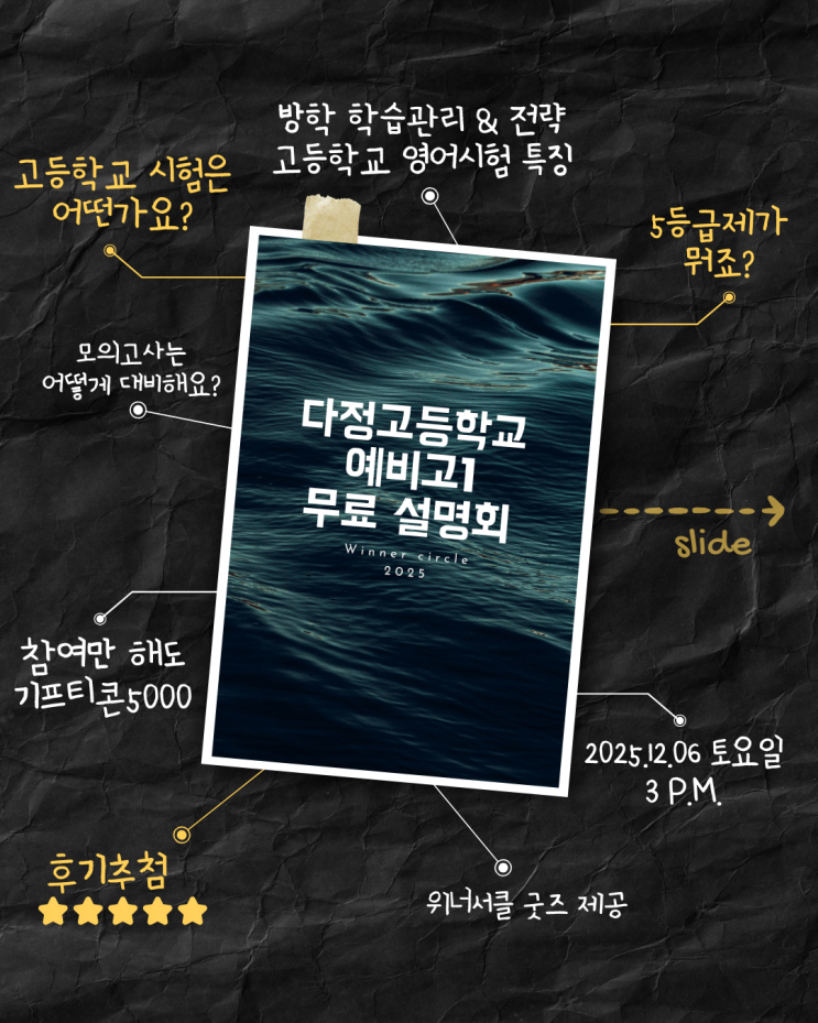 ✨2026 다정고 예비고1 무료 설명회 안내 이번주 토요일 오후 3시, 예비고1 학생 무료 설명회 (다정고/새롬고 1지망) 고등학교 영어 막연하게 어렵다는 얘기는 많이 듣죠. 근데 막상 “뭐가, 어떻게, 얼마나?” 물어보면 정보가 없어 막막하곤 합니다. 그래서 이번 주 토요일, 제가 직접 예비고1 학생들을 대상으호 고등 영어의 실제 판도를 아주 현실적으로 풀어보려고 합니다. 다정고의 경우 최근 3년 내신문제 특징과 공부법까지 전달해보려고 합니다. 또한 2025년부터 시행된 5등급제에 대한 정보와 모의고사 대비 방법, 그리고 겨울방학 학습 방법까지 이야기 나눠보려고 합니다. 설명회에서 다룰 핵심 Q&A ✔ 고등학교 시험은....... <img src="https://blogthumb.pstatic.net/MjAyNTEyMDNfNDcg/MDAxNzY0NzM3NjQ4ODg5.RVIKoCrZhF3PYbybEmiXh2mjsBBnzgghfqMfSCK0W2sg.ibbxEaXV9PrbgvFaMi4HpcJwNAF4NuI5NBzyohDsyqEg.PNG/2.png?type=s3" />