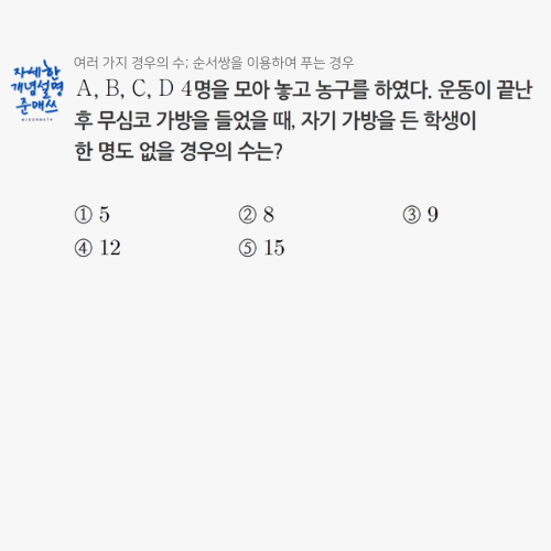중2수학 경우의 수 단원, 가방들기의 경우의 수를 찾는 심화문제입니다. 네 사람이 운동이 끝난 후 무심코 가방을 들었을 때 자신의 가방이 아닌 다른 가방을 드는 경우의 수를 수형도를 그리면서 규칙을 찾아 문제를 해결하는 과정을 학습할 수 있습니다. 풀이 방법은 아래 영상에서 만나볼 수 있습니다. 개념설명은 관련 유튜브 영상을 참고하세요 #중2수학 #중학교수학 #경우의수 #가방들기 #수형도 #응용문제 #심화문제 #기말고사 #내신대비 #준매쓰 #자세한개념설명준매쓰 <img src="https://blogthumb.pstatic.net/MjAyNTEyMDlfMTY3/MDAxNzY1MjU3MTMzNjUw.CY0gb8Kw4RUEd0mJt1Nrdq8fDnpW5aWfukJuZubeMR0g.3tcDsrfDkYKFBY4yQWOhUliXFNnFNO9CiNfMmdxGlcgg.PNG/%C0%C0%BF%EB%BD%C9%C8%AD%C0%AF%C7%FC_%BA%ED%B7%CE%B1%D7_%C0%CC%B9%CC%C1%F6%28%B0%A1%B9%E6%B5%E9%B1%E2_%B0%E6%BF%EC%C0%C7%BC%F6%29.png?type=s3" />