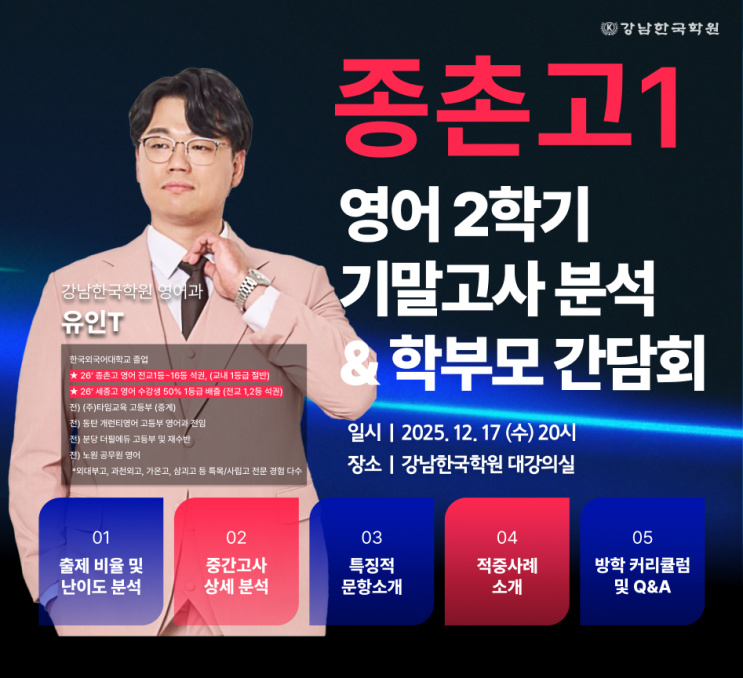 안녕하세요. 세종시 입시전문가그룹 강남한국학원입니다. [종촌고 1학년 영어] 2학기 기말고사 직후 학부모 간담회 안내 1년 동안 우리 학생들이 어떤 방식으로 학습했고, 기말고사 이후 어떤 방향으로 대비를 이어갈지에 대해 학부모님께 자세히 안내드리기 위해 간담회를 준비했습니다. 그동안 시험 직후 간담회 관련 문의가 많았어서, 편안하고 열린 분위기에서 1년간의 학습내용 및 향후 대비전략을 전달드리고자 합니다. 대표강사 유인T 소개 ★ 26’ 종촌고 영어 전교1등~16등 석권, (교내 1등급 절반) ★ 26’ 세종고 영어 수강생 50% 1등급 배출 (전교 1,2등 석권) 한국외국어대학교 졸업 전) (주)타임교육 고등부 (중계....... <img src="https://blogthumb.pstatic.net/MjAyNTEyMTBfOCAg/MDAxNzY1MzM0MzY1OTYx._GB5aSXOowlWDByt0w4-jCWFHQtuQCIYtvey38hTQisg.nynUXHUtEZv7dF4-HA83V2cdq9pHjvtTm54j-3qe4E0g.PNG/image.png?type=s3" />