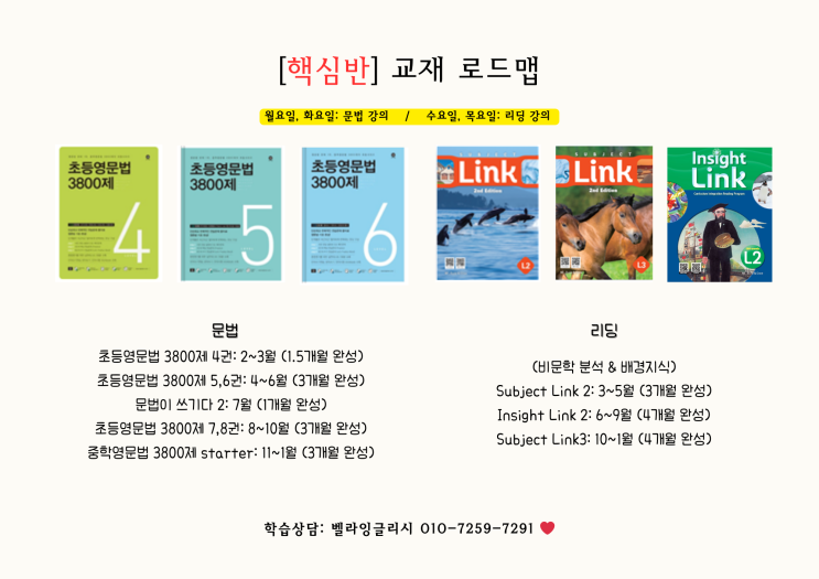 2026년 나성동 벨라잉글리시 핵심반 교재 선정 (초등반이지만 중고등 내신/입시까지 멀리 보고 가르칩니다.) 입시 영어의 본격적인 시작 단계예요. 중등 기초 단계까지 도달하기 위한 1년간의 초등 커리큘럼입니다. 현재 한 자리 남아 있으며, 학습 분위기가 확실히 잡혀 있는 반으로 1년 동안 많은 성장을 하게 될 거예요. ️ '명사, 동사 / 주어, 목적어' 같은 단어를 알고 있지만 정확한 문장 해석이 어렵거나 문법 개념을 설명하기는 어려운 친구들에게 추천합니다. 발음 읽기 / 쓰기 과제 또한 매일 꾸준히 주어집니다. 1. 문법 전체 큰 틀을 잡은 후 세부 내용 또한 아주 꼼꼼하고 체계적으로 정리해요. 어떤....... <img src="https://blogthumb.pstatic.net/MjAyNjAyMThfNTgg/MDAxNzcxMzQ1MzU5NTQ1.OkiO0aEq_zkO-9JbEBsgMr65U4qdmKySa-WbnBq-O8Eg.JezTyEiE5uE80ppTgh-dOWiqKMJI01fH_y4ULp-YUBMg.PNG/%C7%D9%BD%C9%B9%DD_%B1%B3%C0%E7.png?type=s3" />